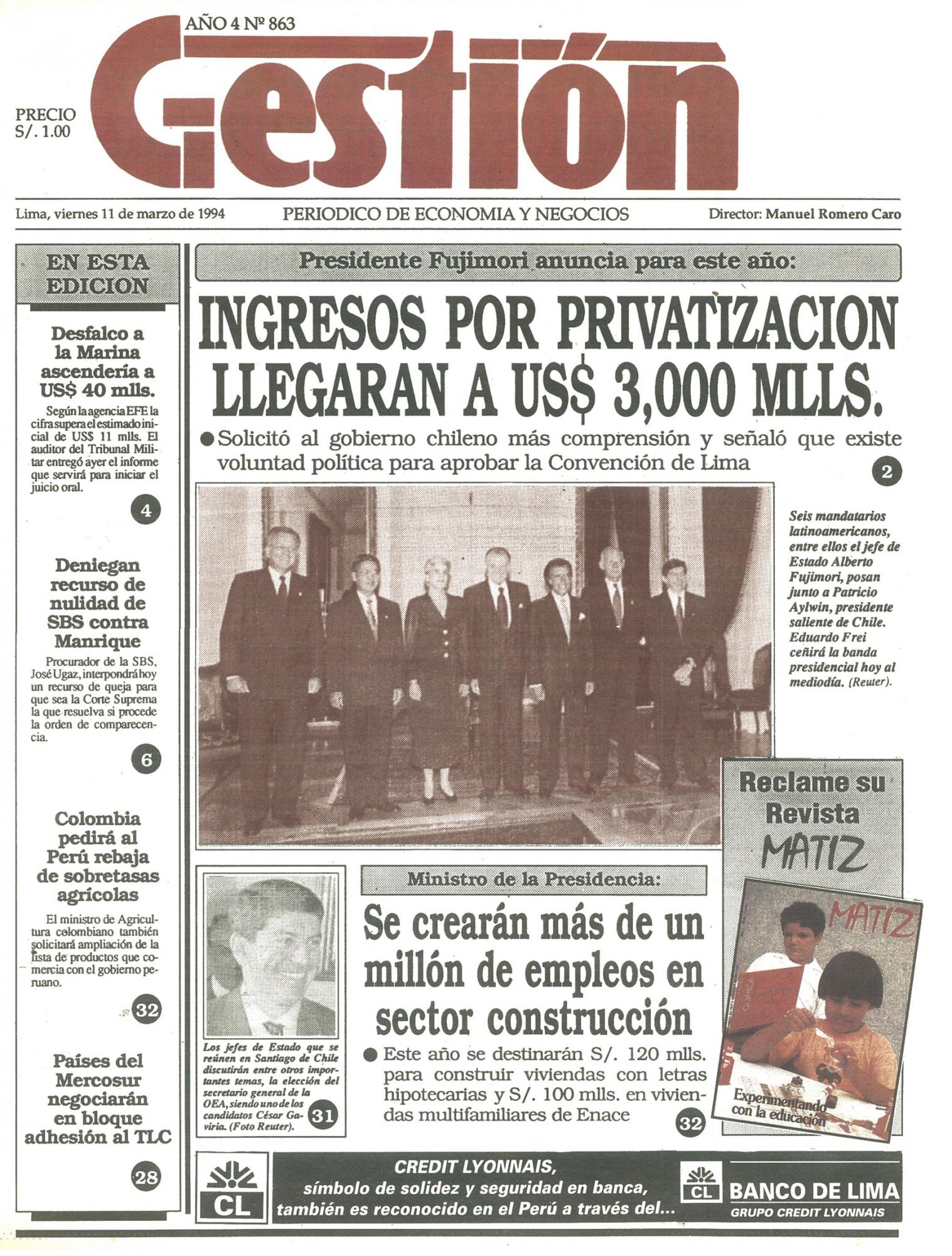 Presidente Fujimori anuncia para este año: INGRESOS POR PRIVATIZACION LLEGARAN A US$ 3,000 MILLONES