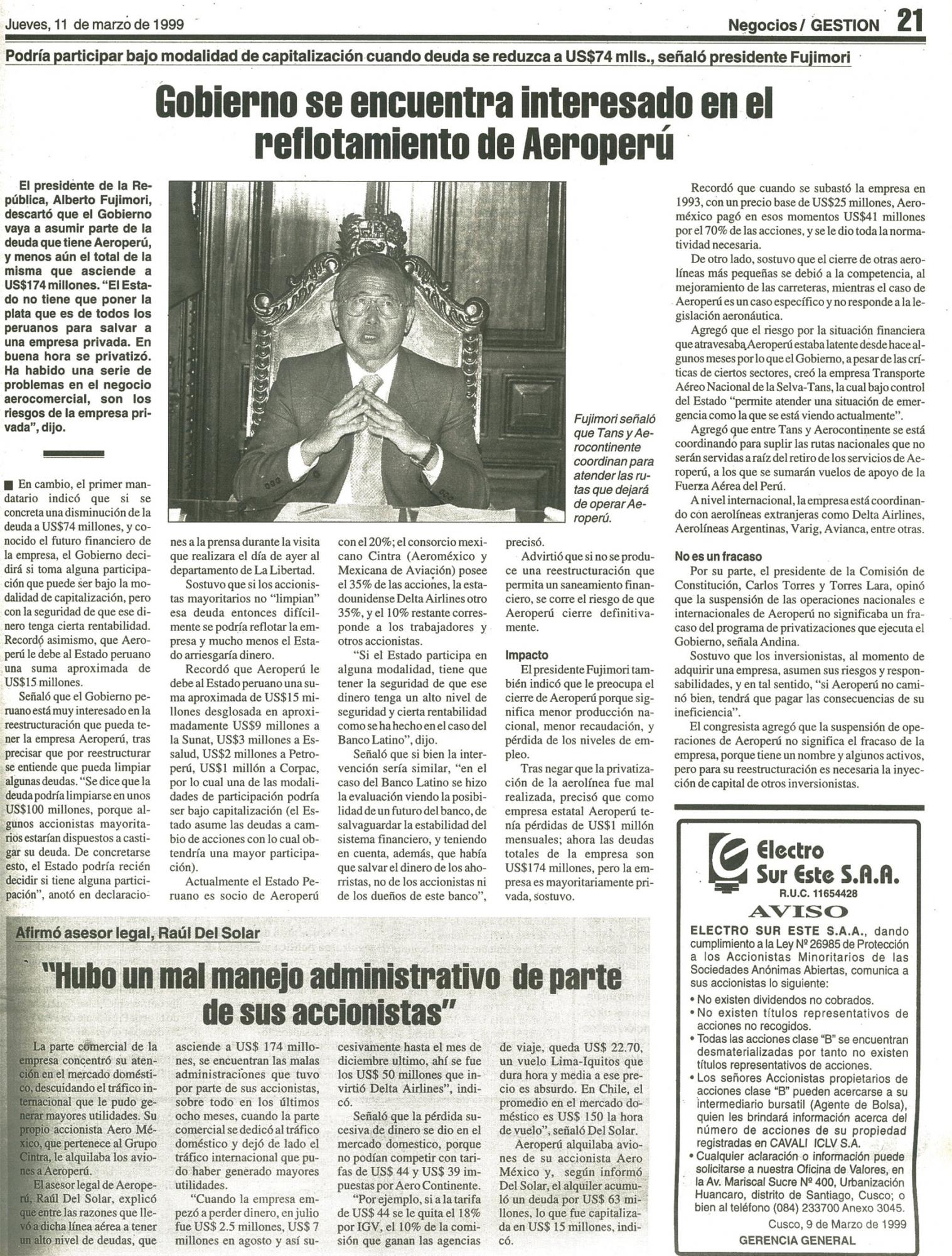 Podría participar bajo modalidad de capitalización cuando deuda se reduzca a US$74 millones, señaló presidente Fujimori.