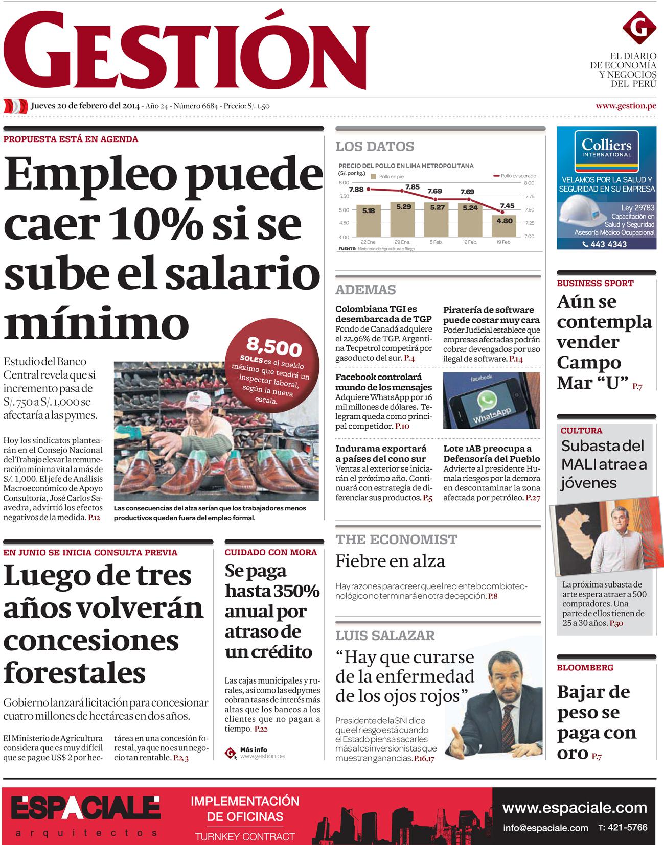 Estudio del Banco Central revela que si incremento pasa de S/. 750 a S/. 1,000 se afectaría a las pymes. Hoy los sindicatos plantearán en el Consejo Nacional del Trabajo elevar la remuneración mínima vital a más de S/. 1,000. El jefe de Análisis Macroeconómico de Apoyo Consultoría, José Carlos Saavedra, advirtió los efectos negativos de la medida. 8,500 soles es el sueldo máximo que tendrá un inspector laboral, según la nueva escala.