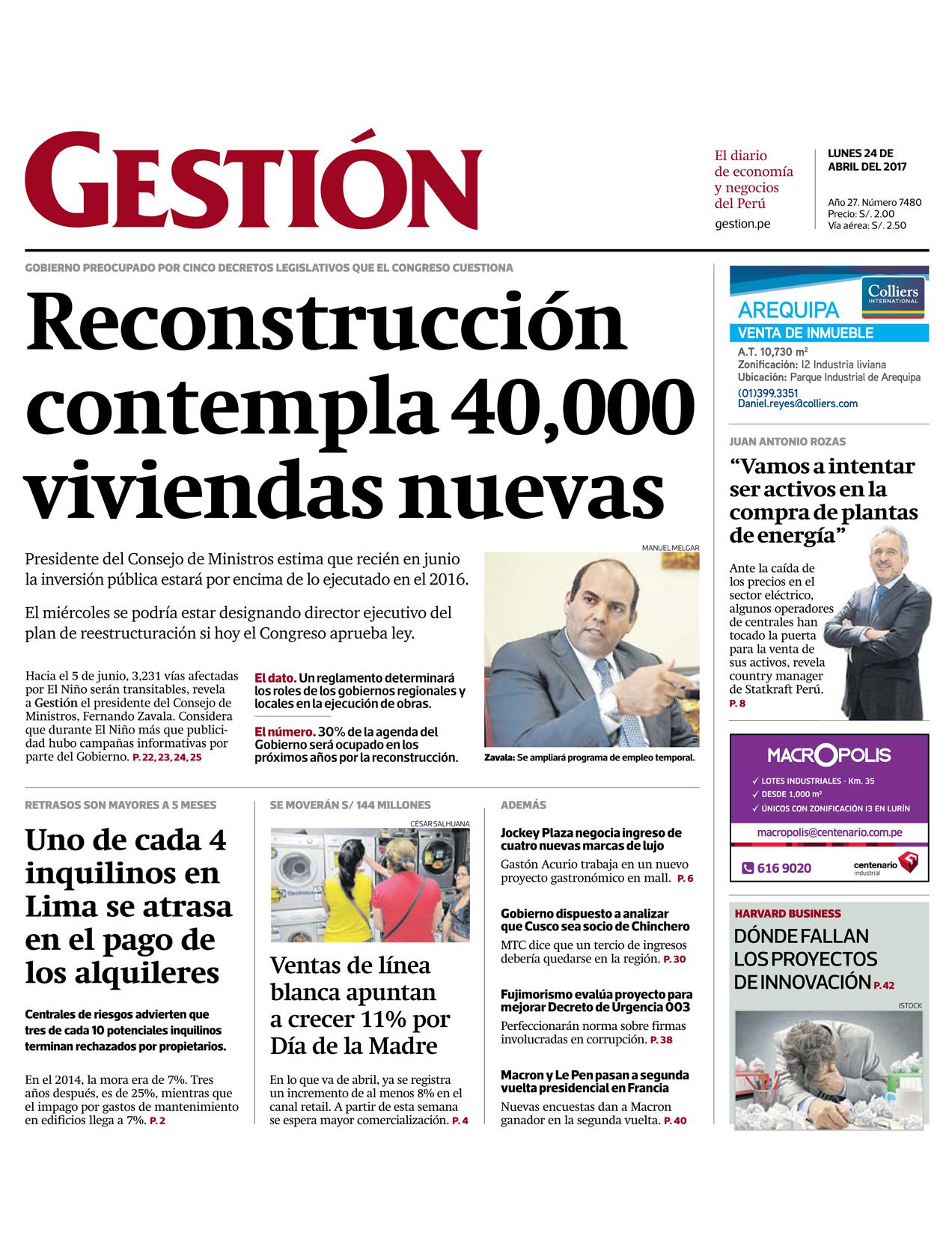 Presidente del Consejo de Ministros estima que recién en junio la inversión pública estará por encima de lo ejecutado en el 2016. El miércoles se podría estar designando director ejecutivo del plan de reestructuración si hoy el Congreso aprueba ley. Hacia el 5 de junio, 3,231 vías afectadas por El Niño serán transitables, revela a Gestión el presidente del Consejo de Ministros, Fernando Zavala. Considera que durante El Niño más que publicidad hubo campañas informativas por parte del Gobierno.
