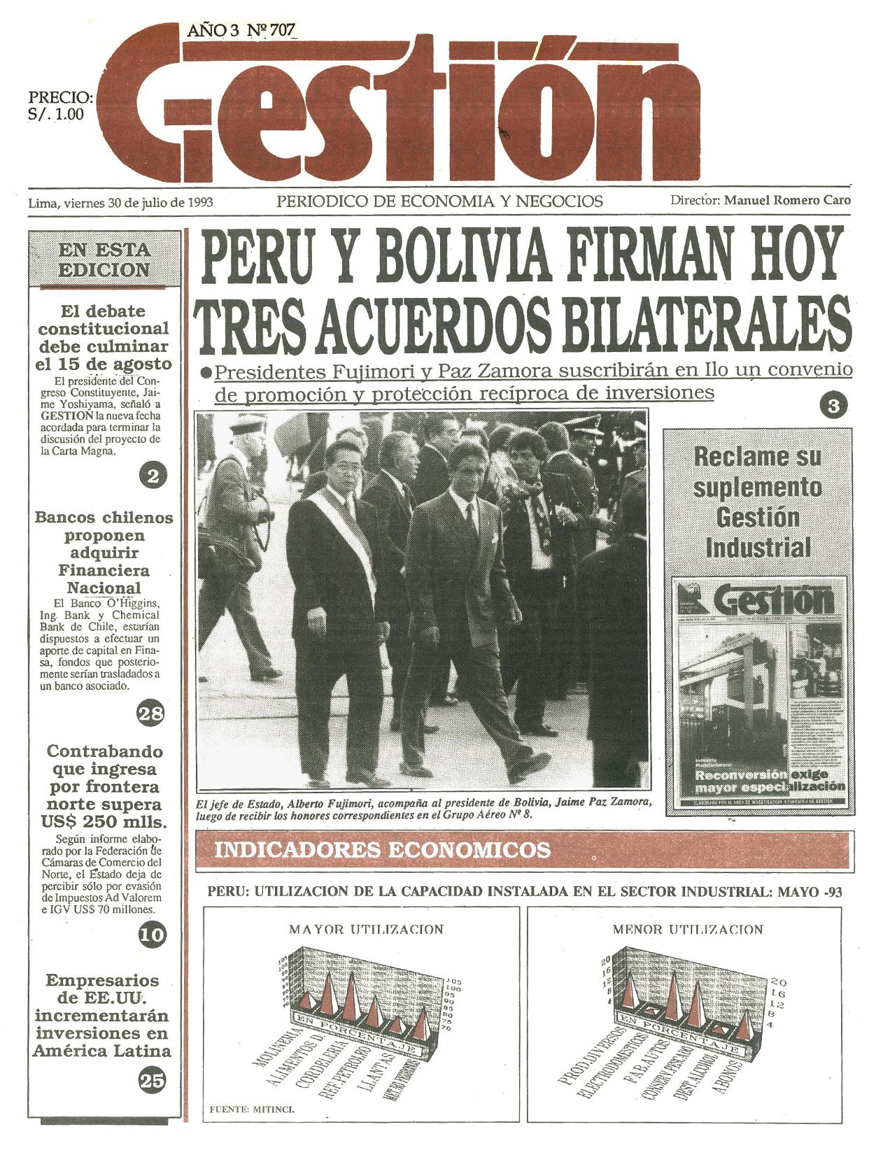 Presidentes Fujimori y Paz Zamora suscribirán en Ilo un convenio de promoción y protección recíproca de inversiones.