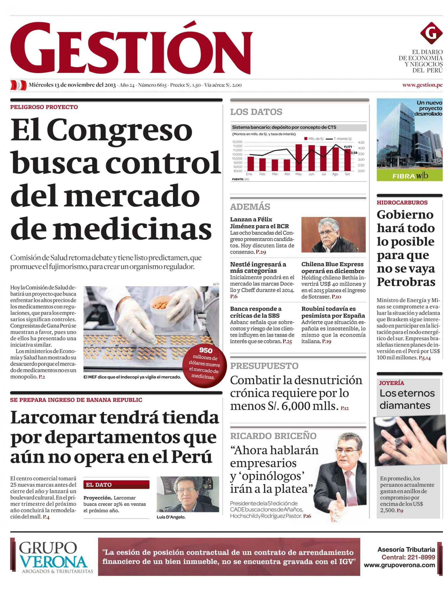 Comisión de Salud retoma debate y tiene listo predictamen, que promueve el fujimorismo, para crear un organismo regulador. Hoy la Comisión de Salud debatirá un proyecto que busca enfrentar los altos precios de los medicamentos con regulaciones, que para los empresarios significan controles. Congresistas de Gana Perú se muestran a favor, pues uno de ellos ha presentado una iniciativa similar. Los ministerios de Economía y Salud han mostrado su desacuerdo porque el mercado de medicamentos no es un monopolio.