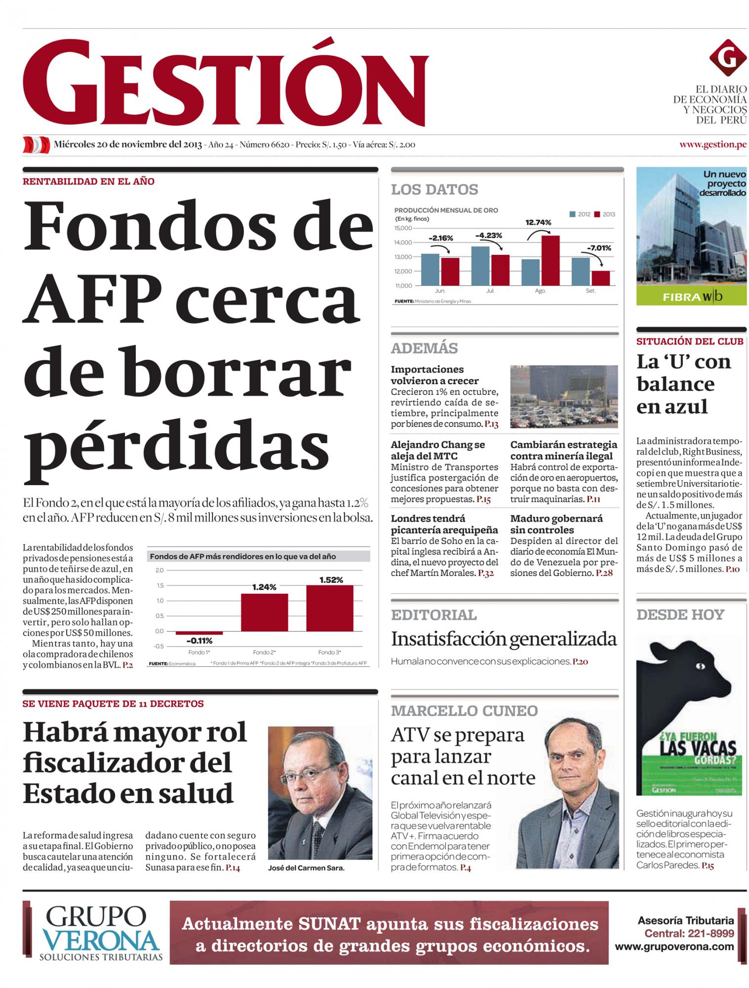 El Fondo 2, en el que está la mayoría de los afiliados, ya gana hasta 1.2% en el año. AFP reducen en S/. 8 mil millones sus inversiones en la bolsa. La rentabilidad de los fondos privados de pensiones está a punto de teñirse de azul, en un año que ha sido complicado para los mercados. Mensualmente, las AFP disponen de US$ 250 millones para invertir, pero solo hallan opciones por US$ 50 millones. Mientras tanto, hay una ola compradora de chilenos y colombianos en la BVL.