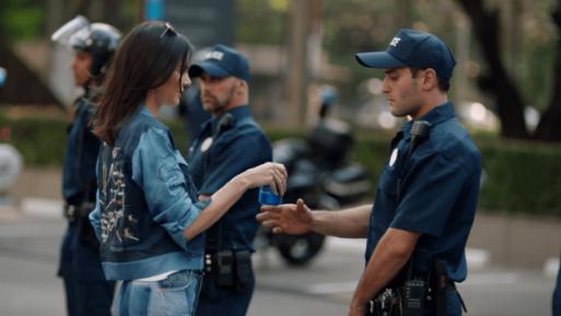 Pero una protesta pasa por delante y ella se muestra curiosa. Hasta que un manifestante la invita a unirse: la modelo se quita su peluca rubia y su ropa cara y se suma a la manifestación, después de lo cual se acerca a un policía y le ofrece una lata de Pepsi.