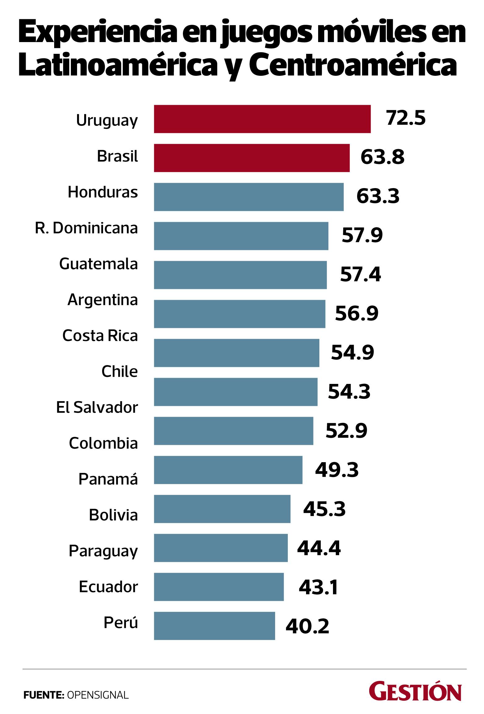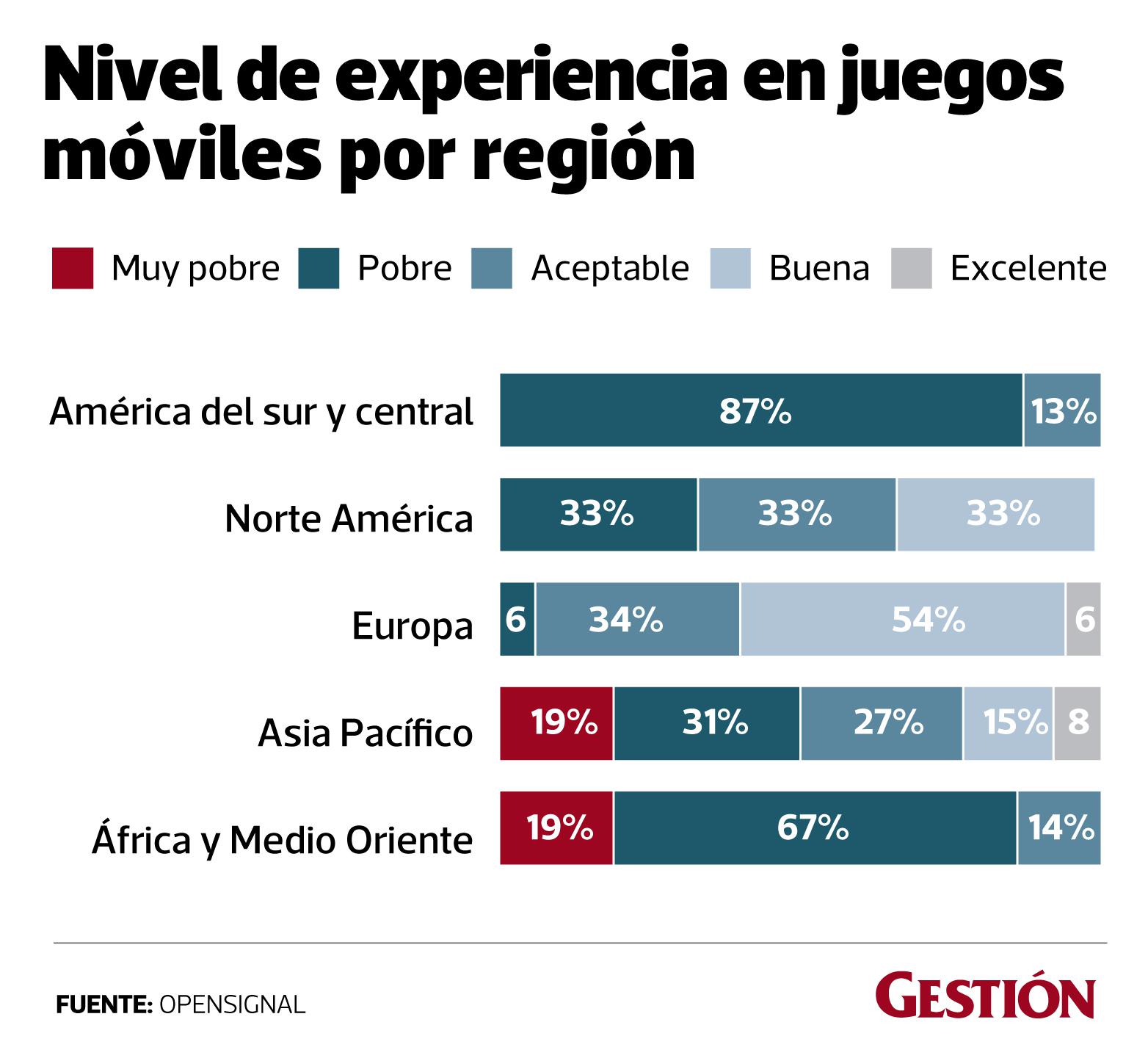 De esa manera, en Sudamérica, Perú registra la peor experiencia en juegos móviles (ver gráfico), superado por Ecuador, Paraguay, Bolivia y los demás países, aunque la mayoría de estos (87%) también se ubica en la referida categoría, mostrando así una situación bastante homogénea.