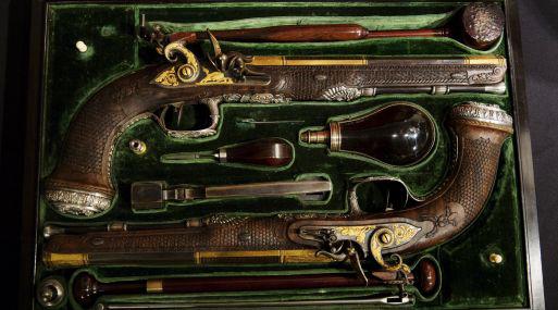 Las armas, acondicionadas en un cofre de madera, incrustadas en oro y plata, con símbolos de la mitología griega y romana, fueron fabricadas por artesanos de Versalles en 1825.