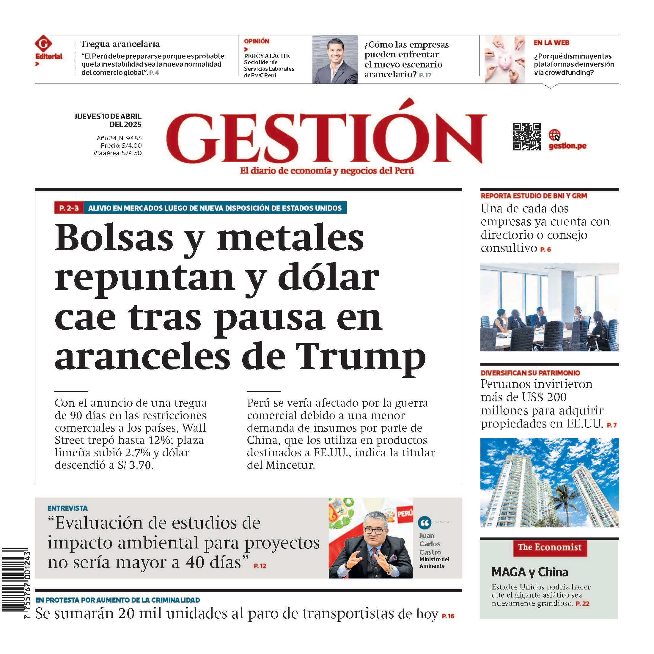 Con el anuncio de una tregua de 90 días en las restricciones comerciales a los países, Wall Street trepó hasta 12%; plaza limeña subió 2.7% y dólar descendió a S/ 3.70. Perú se vería afectado por la guerra comercial debido a una menor demanda de insumos por parte de China, que los utiliza en productos destinados a EE.UU., indica la titular del Mincetur.