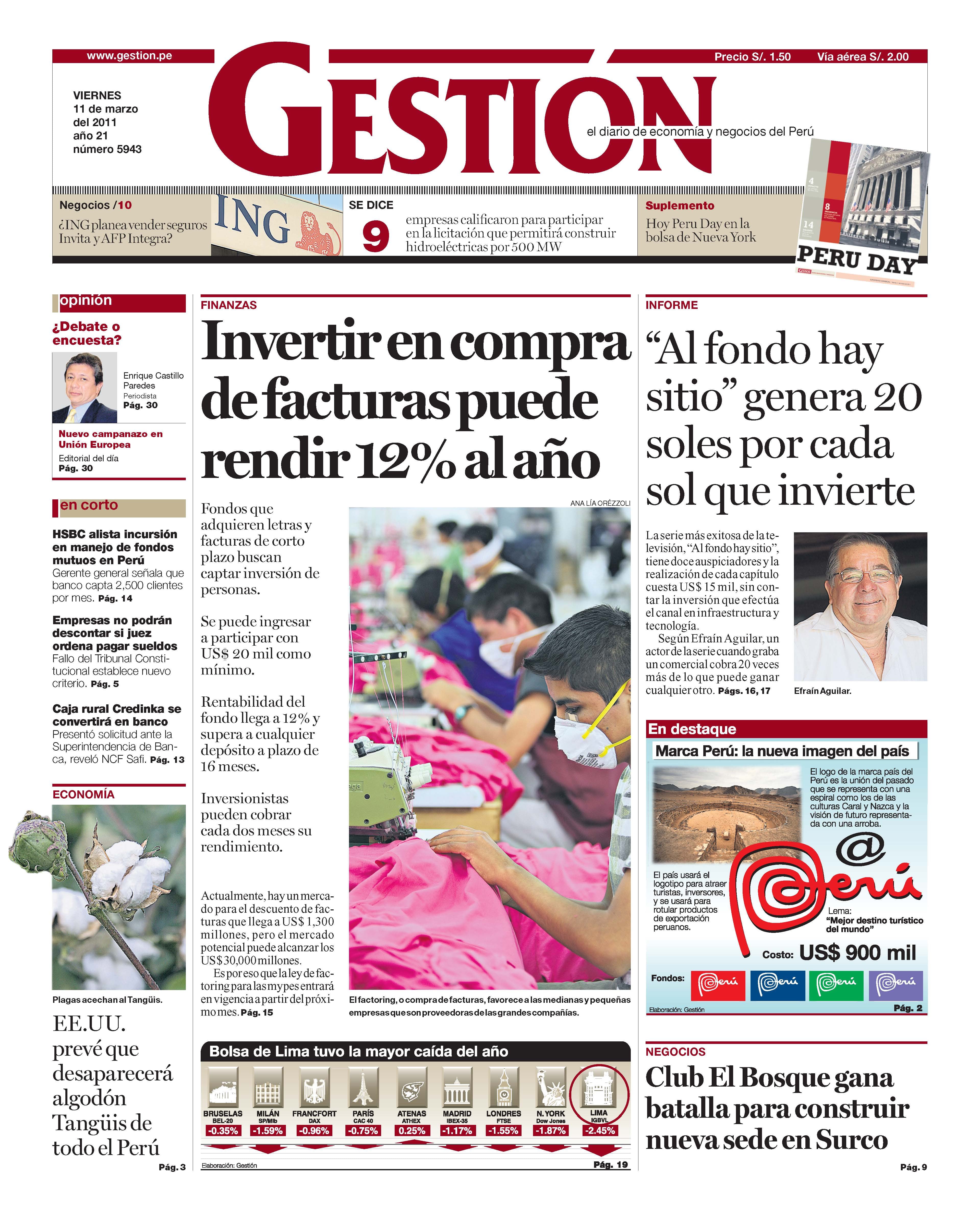 Fondos que adquieren letras y facturas de corto plazo buscan captar inversión de personas. Se puede ingresar a participar con US$ 20 mil como mínimo. Rentabilidad del fondo llega a 12% y supera a cualquier depósito a plazo de 16 meses. Inversionistas pueden cobrar cada dos meses su rendimiento. Actualmente, hay un mercado para el descuento de facturas que llega a US$ 1,300 millones, pero el mercado potencial puede alcanzar los US$ 30,000 millones. Es por eso que la ley de factoring para las mypes entrará en vigencia a partir del próximo mes.