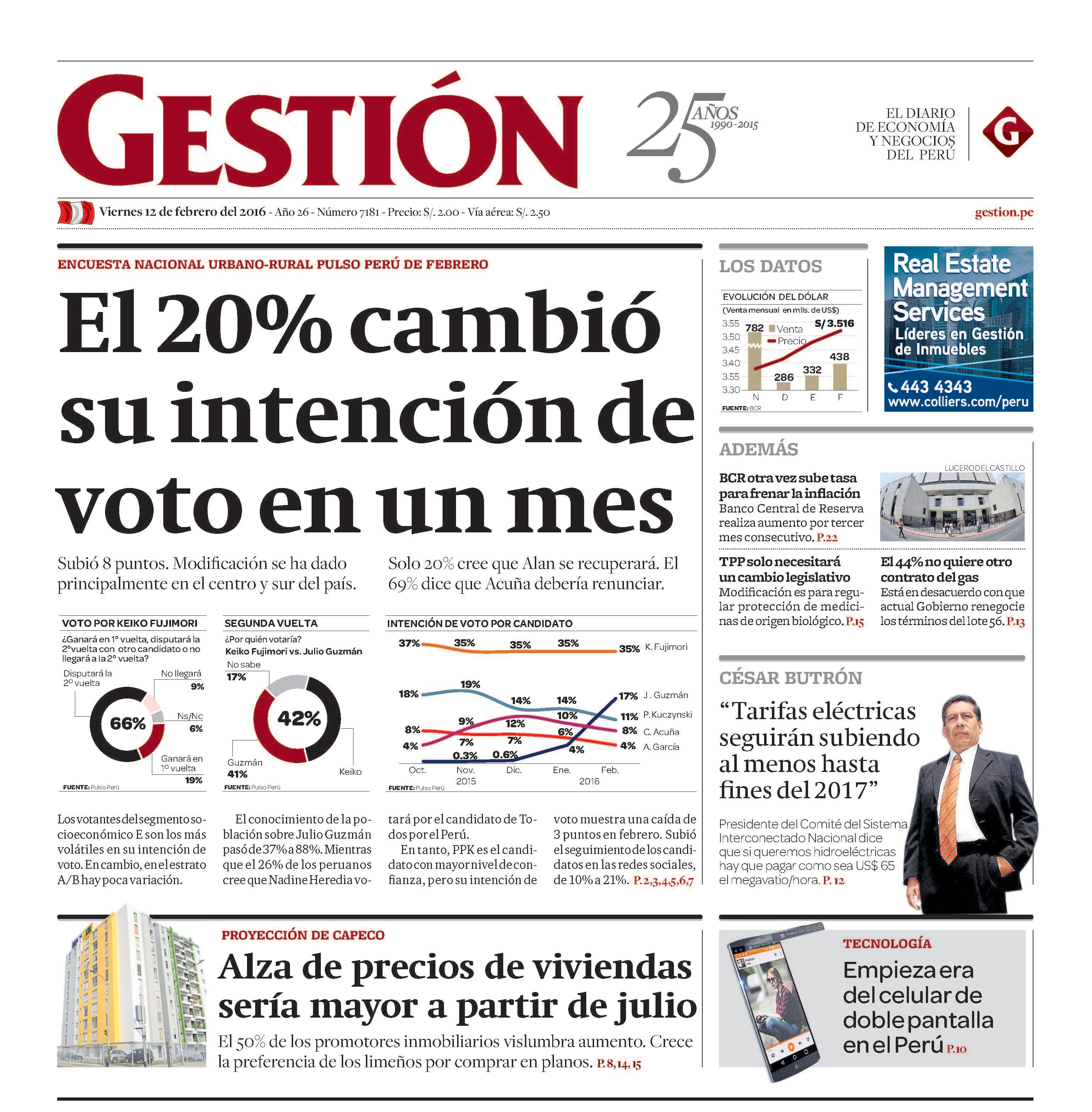 Subió 8 puntos. Modificación se ha dado principalmente en el centro y sur del país. Solo 20% cree que Alan se recuperará. El 69% dice que Acuña debería renunciar. Los votantes del segmento socioeconómico E son los más volátiles en su intención de voto. En cambio, en el estrato A/B hay poca variación. El conocimiento de la población sobre Julio Guzmán pasó de 37% a 88%. Mientras que el 26% de los peruanos cree que Nadine Heredia votará por el candidato de Todos por el Perú. En tanto, PPK es el candidato con mayor nivel de confianza, pero su intención de voto muestra una caída de 3 puntos en febrero. Subió el seguimiento de los candidatos en las redes sociales, de 10% a 21%.