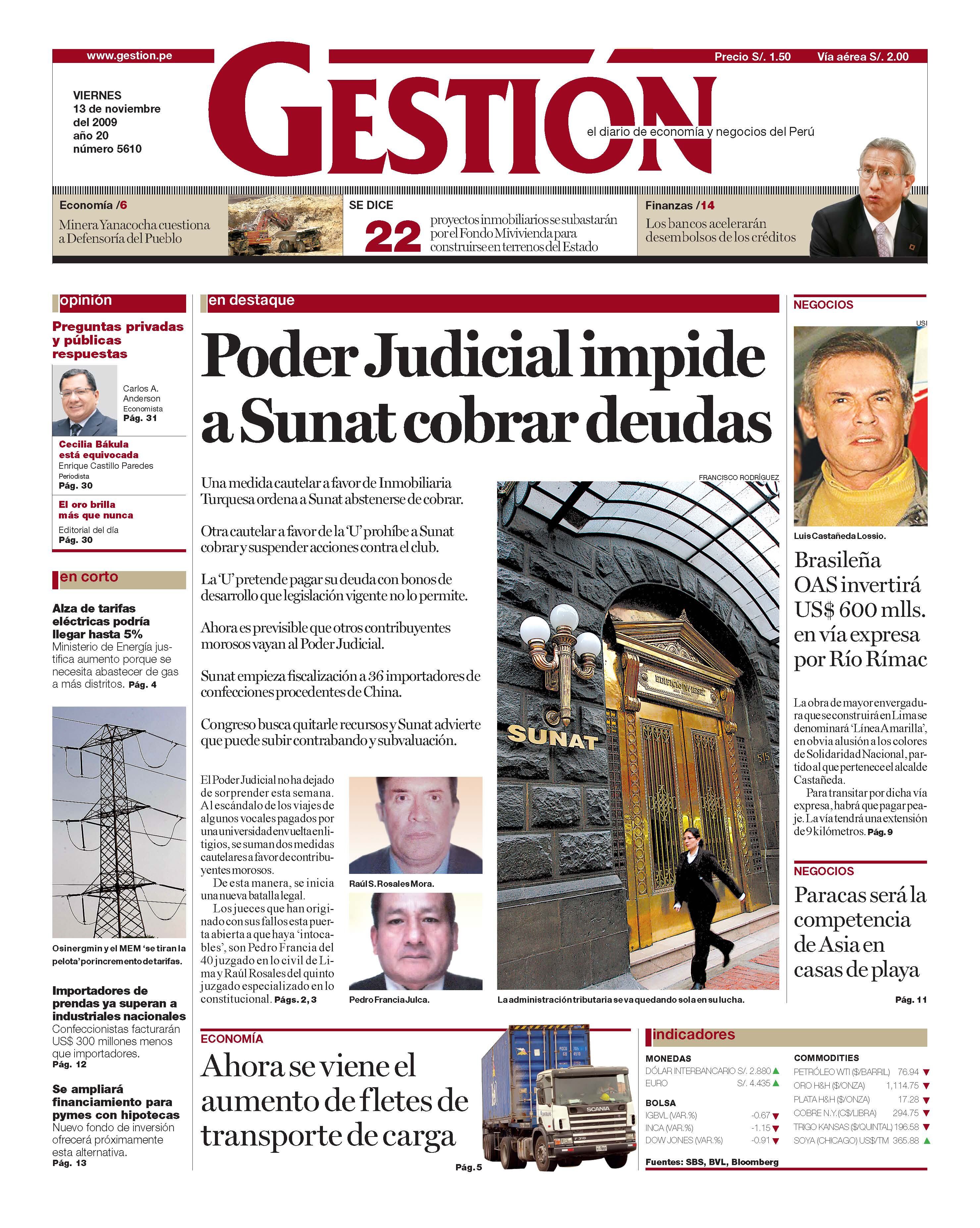Una medida cautelar a favor de Inmobiliaria Turquesa ordena a Sunat abstenerse de cobrar. Otra cautelar a favor de la ‘U’ prohíbe a Sunat cobrar y suspender acciones contra el club. La ‘U’ pretende pagar su deuda con bonos de desarrollo que legislación vigente no lo permite. Ahora es previsible que otros contribuyentes morosos vayan al Poder Judicial. Sunat empieza fiscalización a 36 importadores de confecciones procedentes de China. Congreso busca quitarle recursos y Sunat advierte que puede subir contrabando y subvaluación. El Poder Judicial no ha dejado de sorprender esta semana. Al escándalo de los viajes de algunos vocales pagados por una universidad envuelta en litigios, se suman dos medidas cautelares a favor de contribuyentes morosos.