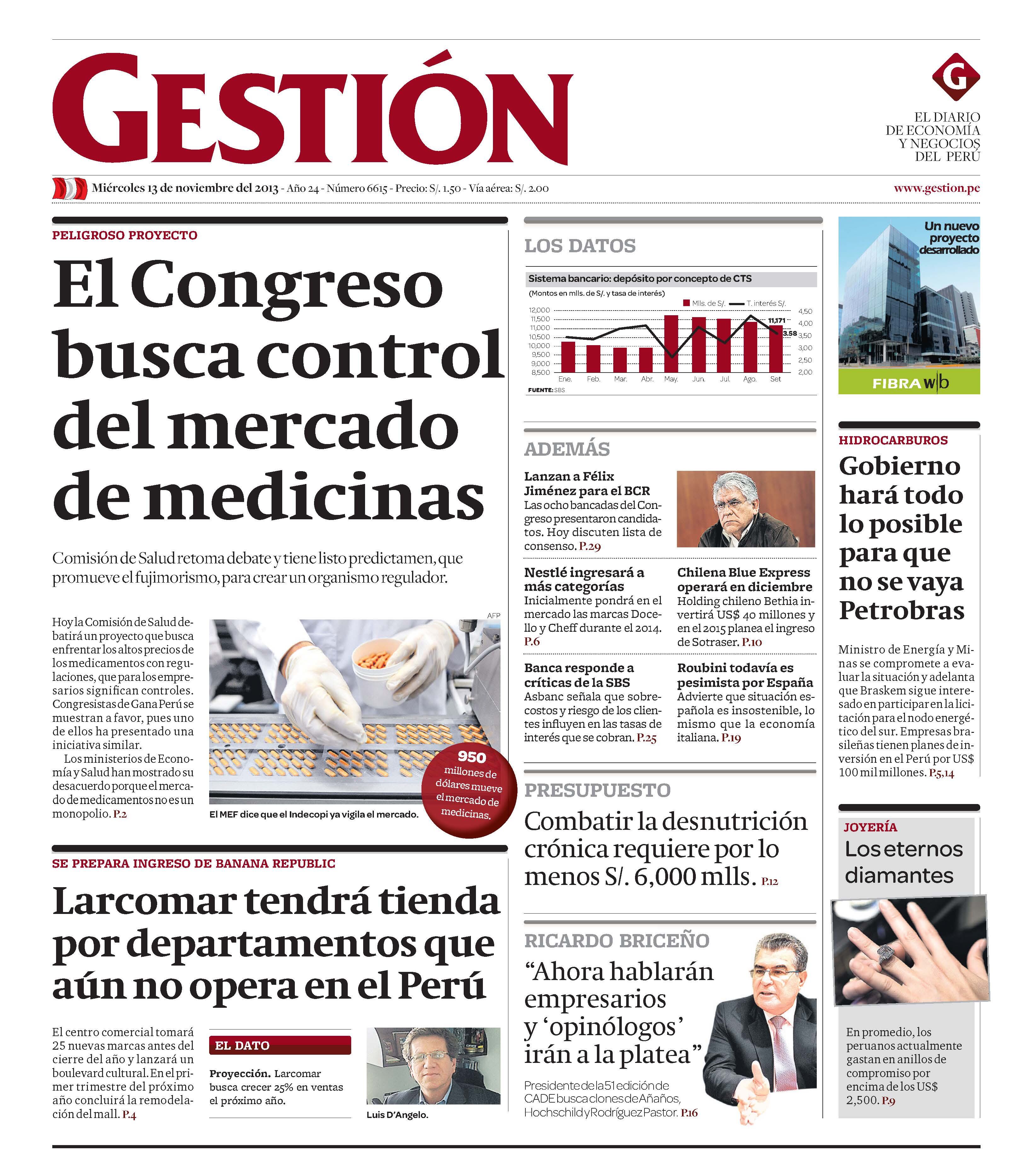Comisión de Salud retoma debate y tiene listo predictamen, que promueve el fujimorismo, para crear un organismo regulador. Hoy la Comisión de Salud debatirá un proyecto que busca enfrentar los altos precios de los medicamentos con regulaciones, que para los empresarios significan controles. Congresistas de Gana Perú se muestran a favor, pues uno de ellos ha presentado una iniciativa similar. Los ministerios de Economía y Salud han mostrado su desacuerdo porque el mercado de medicamentos no es un monopolio.