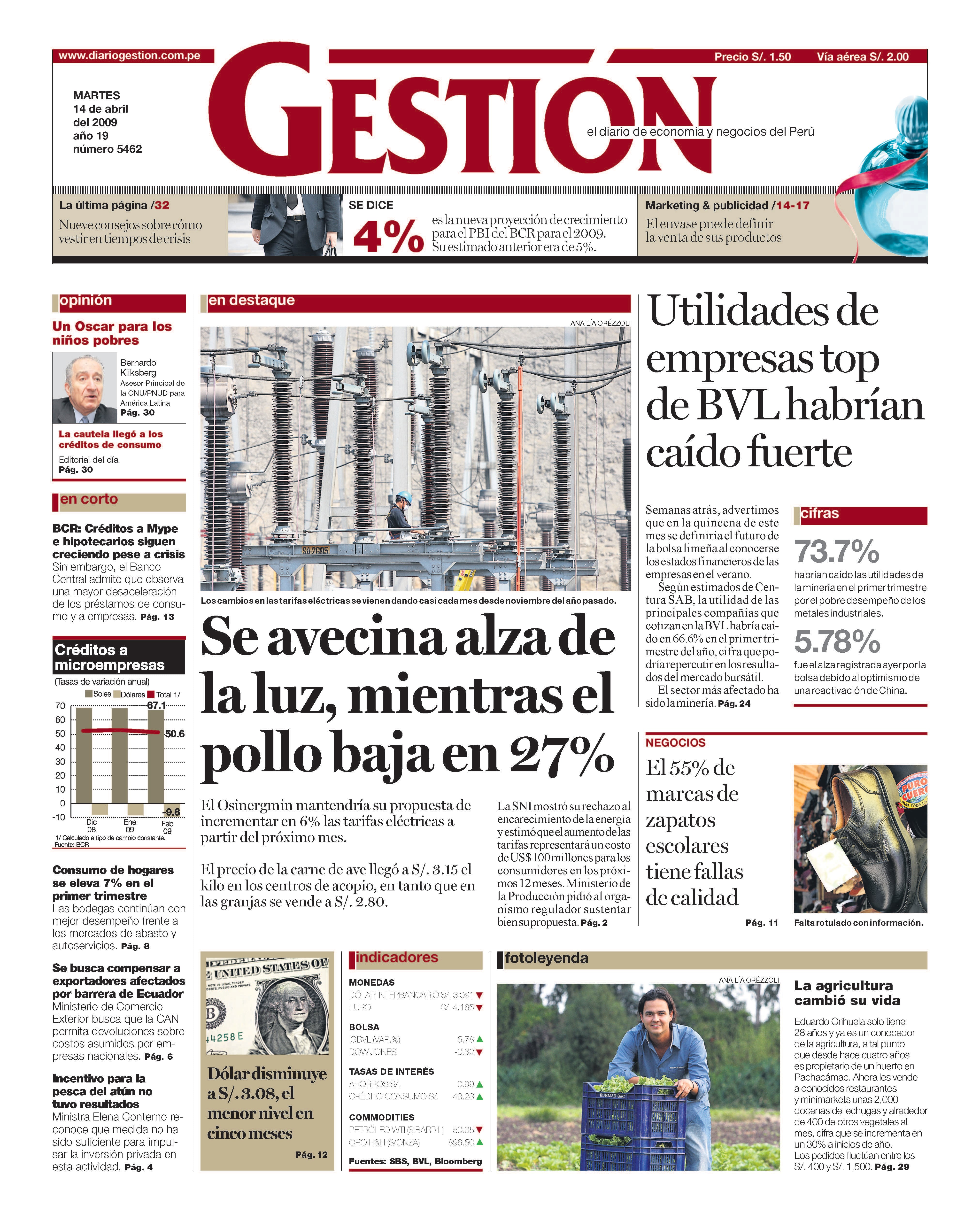 El Osinergmin mantendría su propuesta de incrementar en 6% las tarifas eléctricas a partir del próximo mes. El precio de la carne de ave llegó a S/. 3.15 el kilo en los centros de acopio, en tanto que en las granjas se vende a S/. 2.80. La SNI mostró su rechazo al encarecimiento de la energía y estimó que el aumento de las tarifas representará un costo de US$ 100 millones para los consumidores en los próximos 12 meses. Ministerio de la Producción pidió al organismo regulador sustentar bien su propuesta.