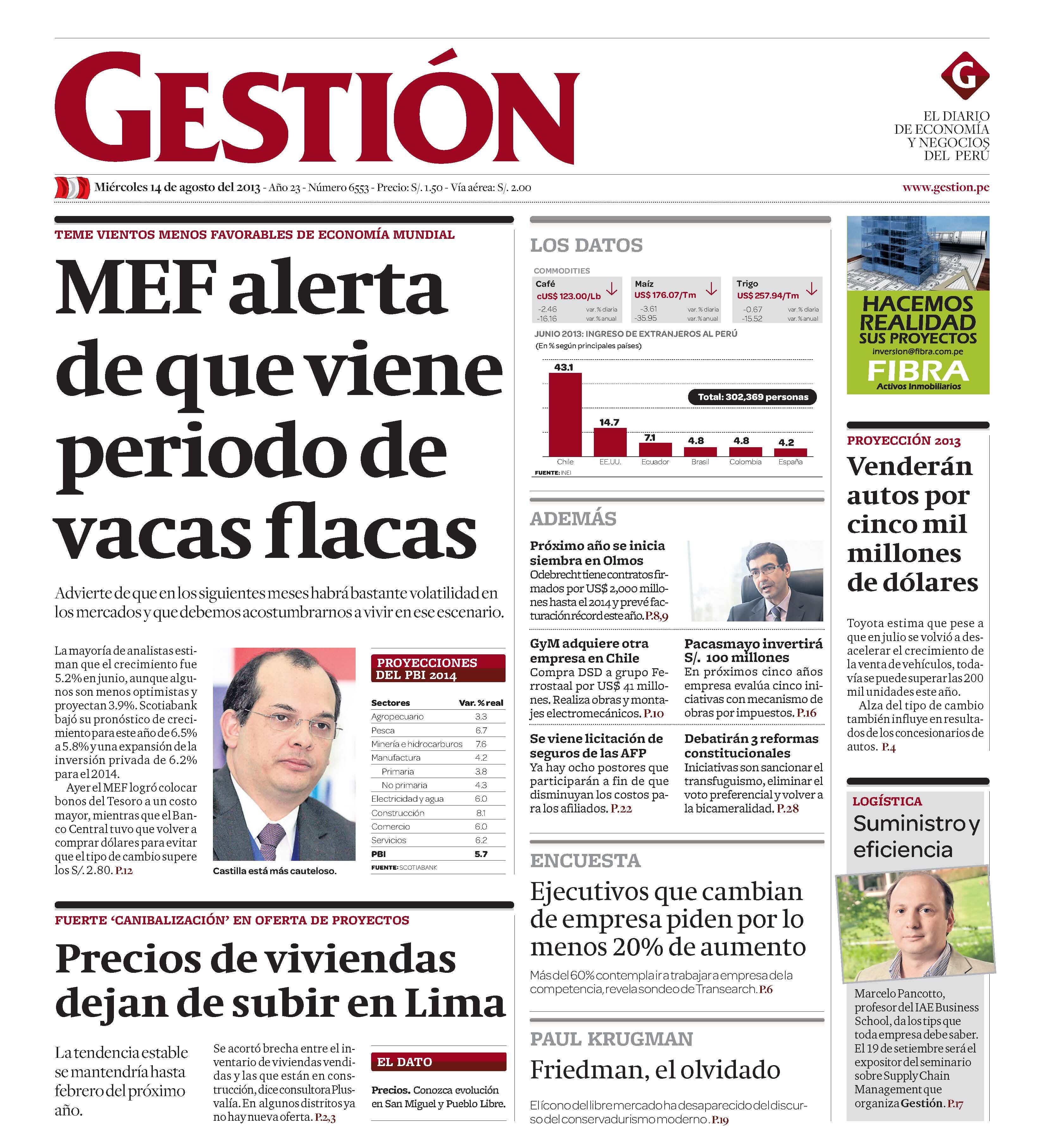 Advierte de que en los siguientes meses habrá bastante volatilidad en los mercados y que debemos acostumbrarnos a vivir en ese escenario. La mayoría de analistas estiman que el crecimiento fue 5.2% en junio, aunque algunos son menos optimistas y proyectan 3.9%. Scotiabank bajó su pronóstico de crecimiento para este año de 6.5% a 5.8% y una expansión de la inversión privada de 6.2% para el 2014. Ayer el MEF logró colocar bonos del Tesoro a un costo mayor, mientras que el Banco Central tuvo que volver a comprar dólares para evitar que el tipo de cambio supere los S/. 2.80.