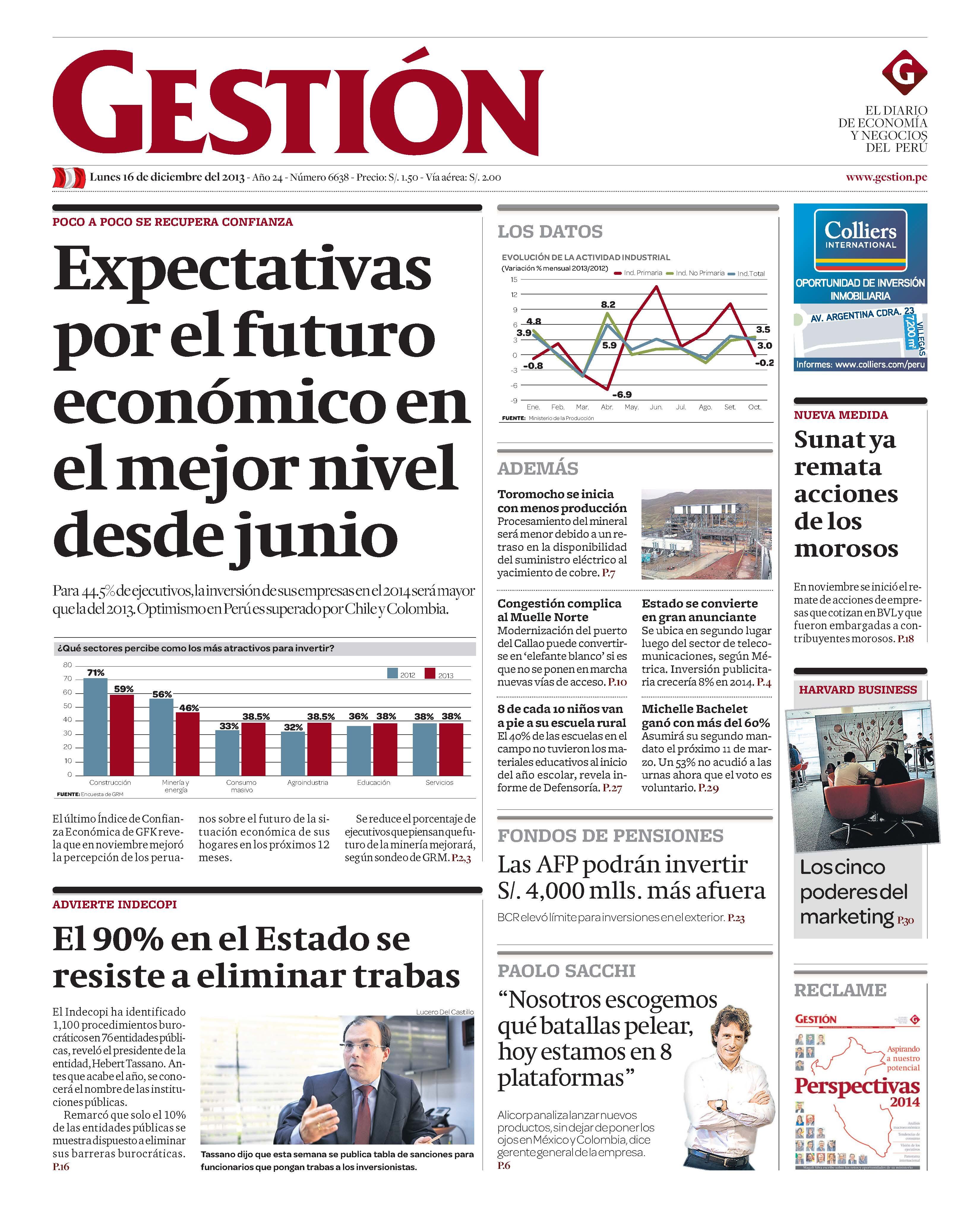 Para 44.5% de ejecutivos, la inversión de sus empresas en el 2014 será mayor que la del 2013. Optimismo en Perú es superado por Chile y Colombia. El último Indice de Confianza Económica de GFK revela que en noviembre mejoró la percepción de los peruanos sobre el futuro de la situación económica de sus hogares en los próximos 12 meses. Se reduce el porcentaje de ejecutivos que piensan que futuro de la minería mejorará, según sondeo de GRM.