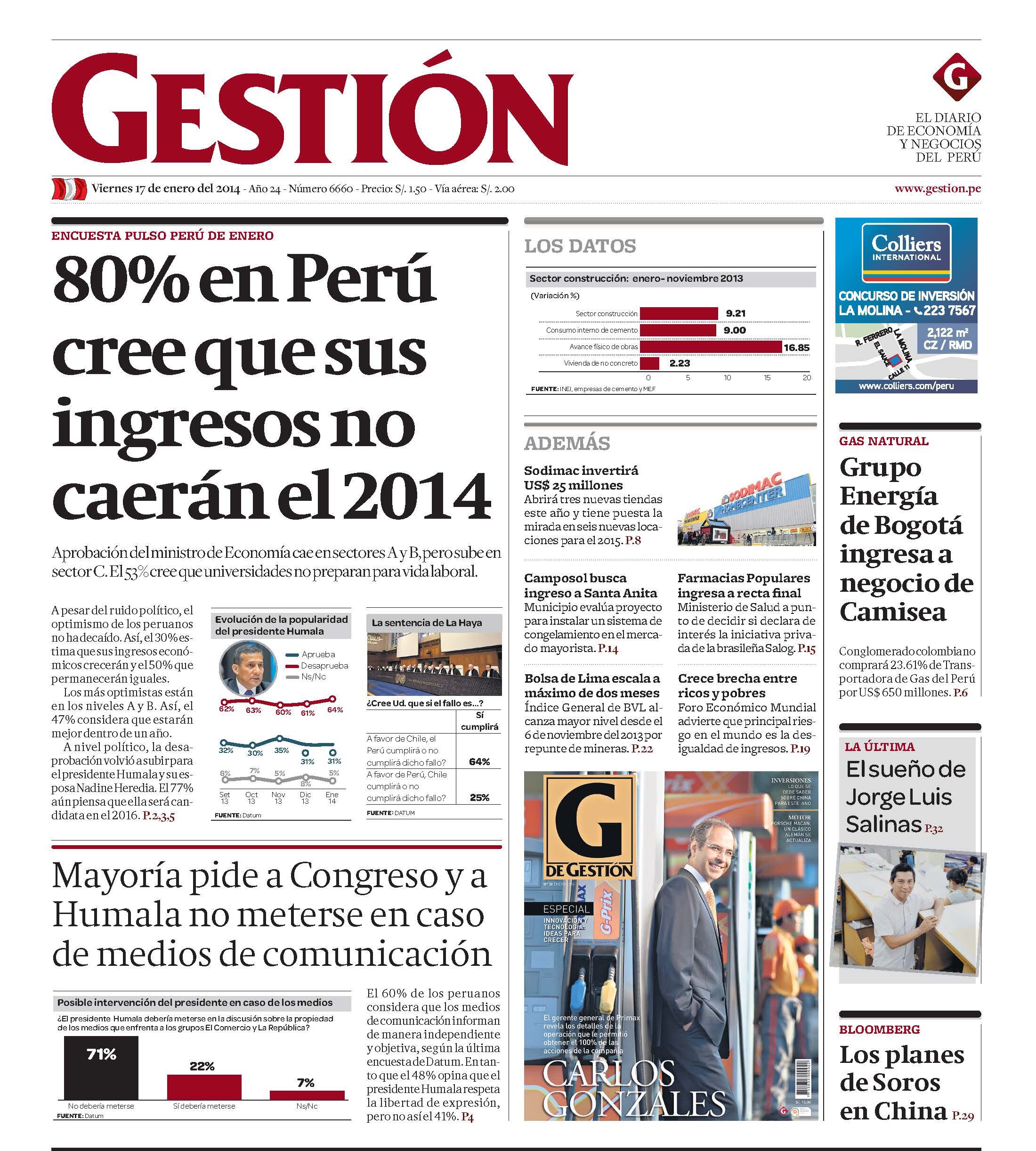 80% EN PERÚ CREE QUE SUS INGRESOS NO CAERÁN EL 2014