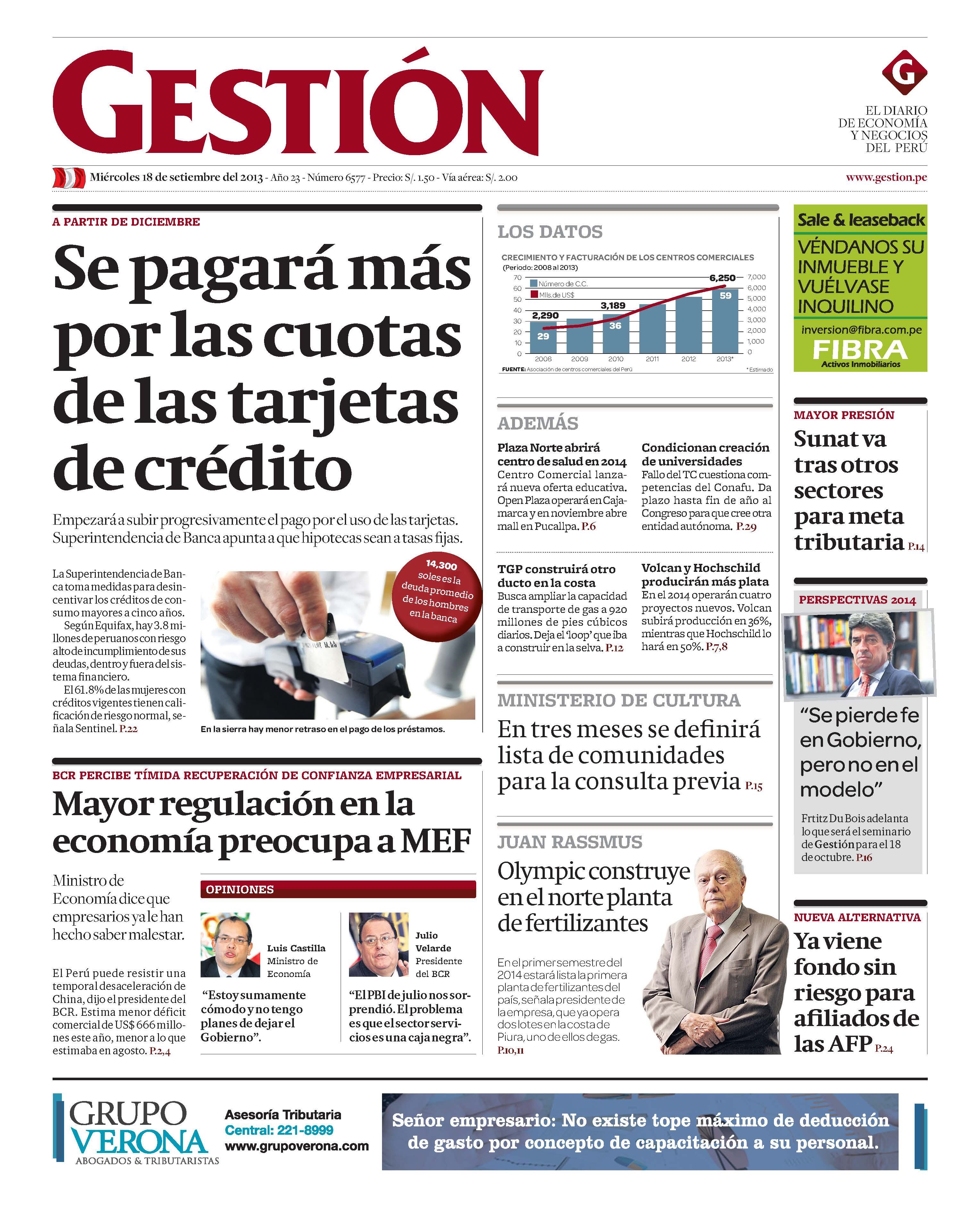 Empezará a subir progresivamente el pago por el uso de las tarjetas. Superintendencia de Banca apunta a que hipotecas sean a tasas fijas. La Superintendencia de Banca toma medidas para desincentivar los créditos de consumo mayores a cinco años. Según Equifax, hay 3.8 millones de peruanos con riesgo alto de incumplimiento de sus deudas, dentro y fuera del sistema financiero.