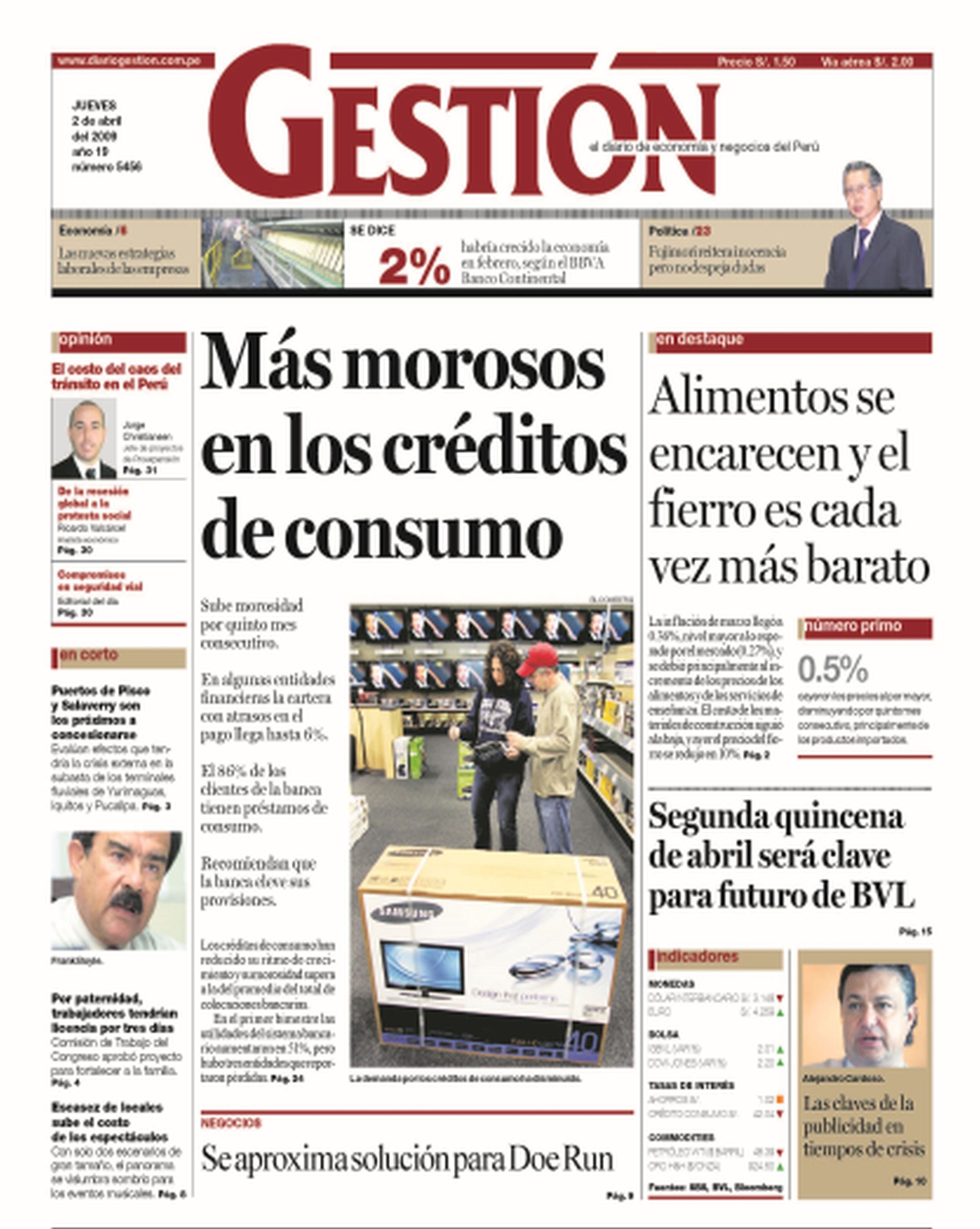 Sube morosidad por quinto mes consecutivo. En algunas entidades financieras la cartera con atrasos en el pago llega hasta 6%. El 86% de los clientes de la banca tienen préstamos de consumo. Recomiendan que la banca eleve sus provisiones. Los créditos de consumo han reducido su ritmo de crecimiento y su morosidad supera a la del promedio del total de colocaciones bancarias. En el primer bimestre las utilidades del sistema bancario aumentaron en 51%, pero hubo tres entidades que reportaron pérdidas.