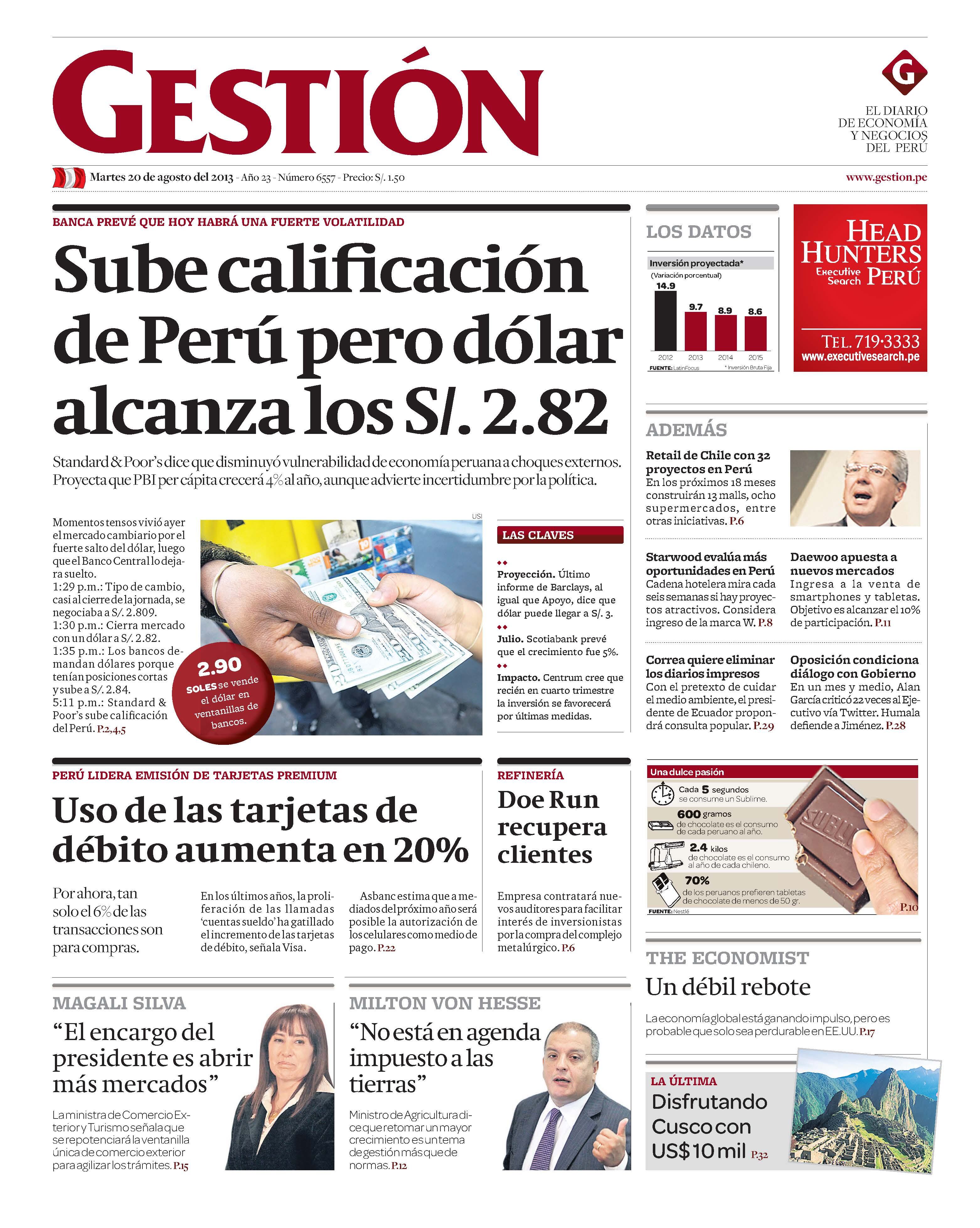 Standard & Poor’s dice que disminuyó vulnerabilidad de economía peruana a choques externos. Proyecta que PBI per cápita crecerá 4% al año, aunque advierte incertidumbre por la política. Momentos tensos vivió ayer el mercado cambiario por el fuerte salto del dólar, luego que el Banco Central lo dejara suelto. 1:29 p.m.: Tipo de cambio, casi al cierre de la jornada, se negociaba a S/. 2.809. 1:30 p.m.: Cierra mercado con un dólar a S/. 2.82. 1:35 p.m.: Los bancos demandan dólares porque tenían posiciones cortas y sube a S/. 2.84. 5:11 p.m.: Standard & Poor’s sube calificación del Perú.