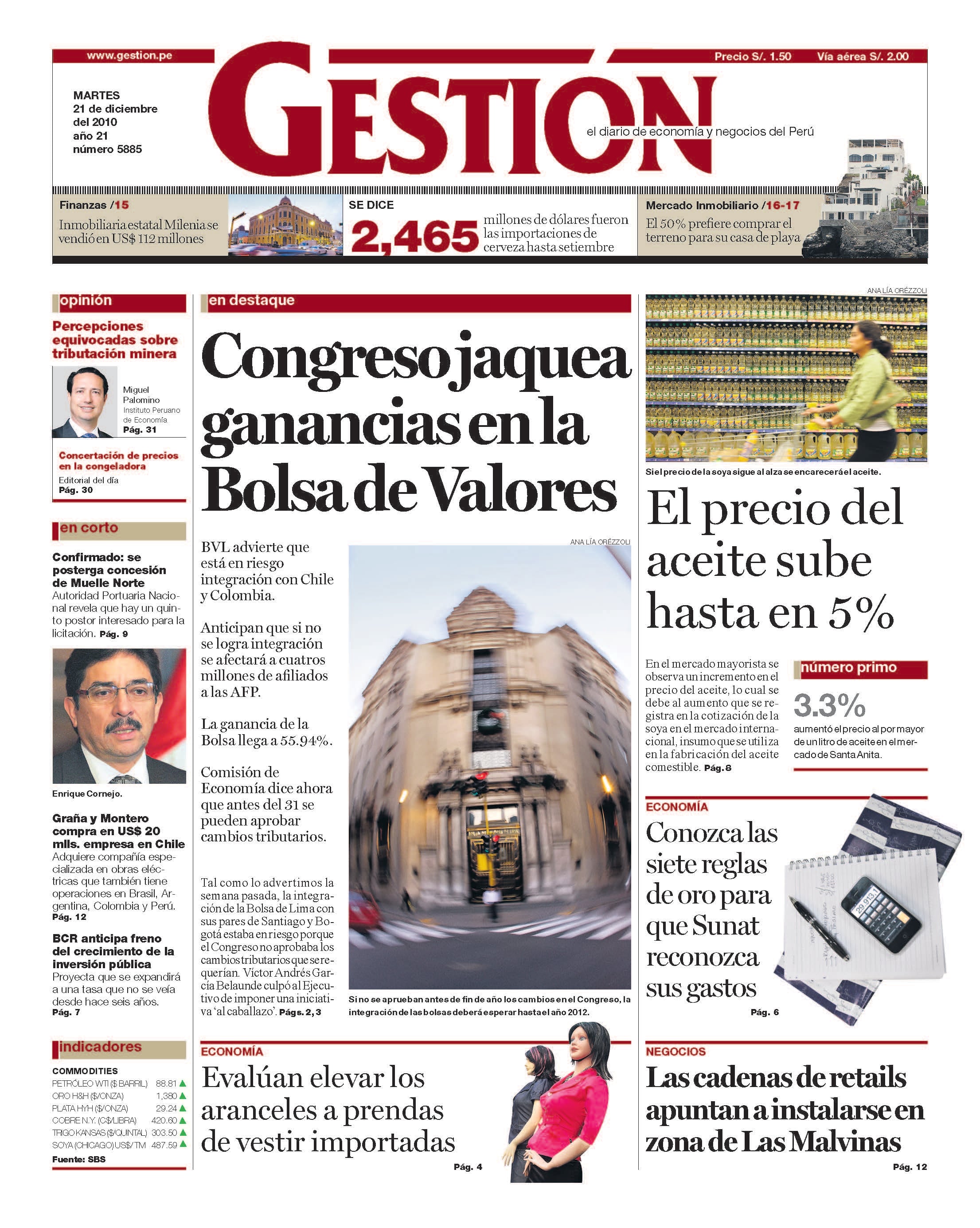 BVL advierte que está en riesgo integración con Chile y Colombia. Anticipan que si no se logra integración se afectará a cuatros millones de afiliados a las AFP. La ganancia de la Bolsa llega a 55.94%. Comisión de Economía dice ahora que antes del 31se pueden aprobar cambios tributarios. Tal como lo advertimos la semana pasada, la integración de la Bolsa de Lima con sus pares de Santiago y Bogotá estaba en riesgo porque el Congreso no aprobaba los cambios tributarios que se requerían. Víctor Andrés García Belaunde culpó al Ejecutivo de imponer una iniciativa ‘al caballazo’.