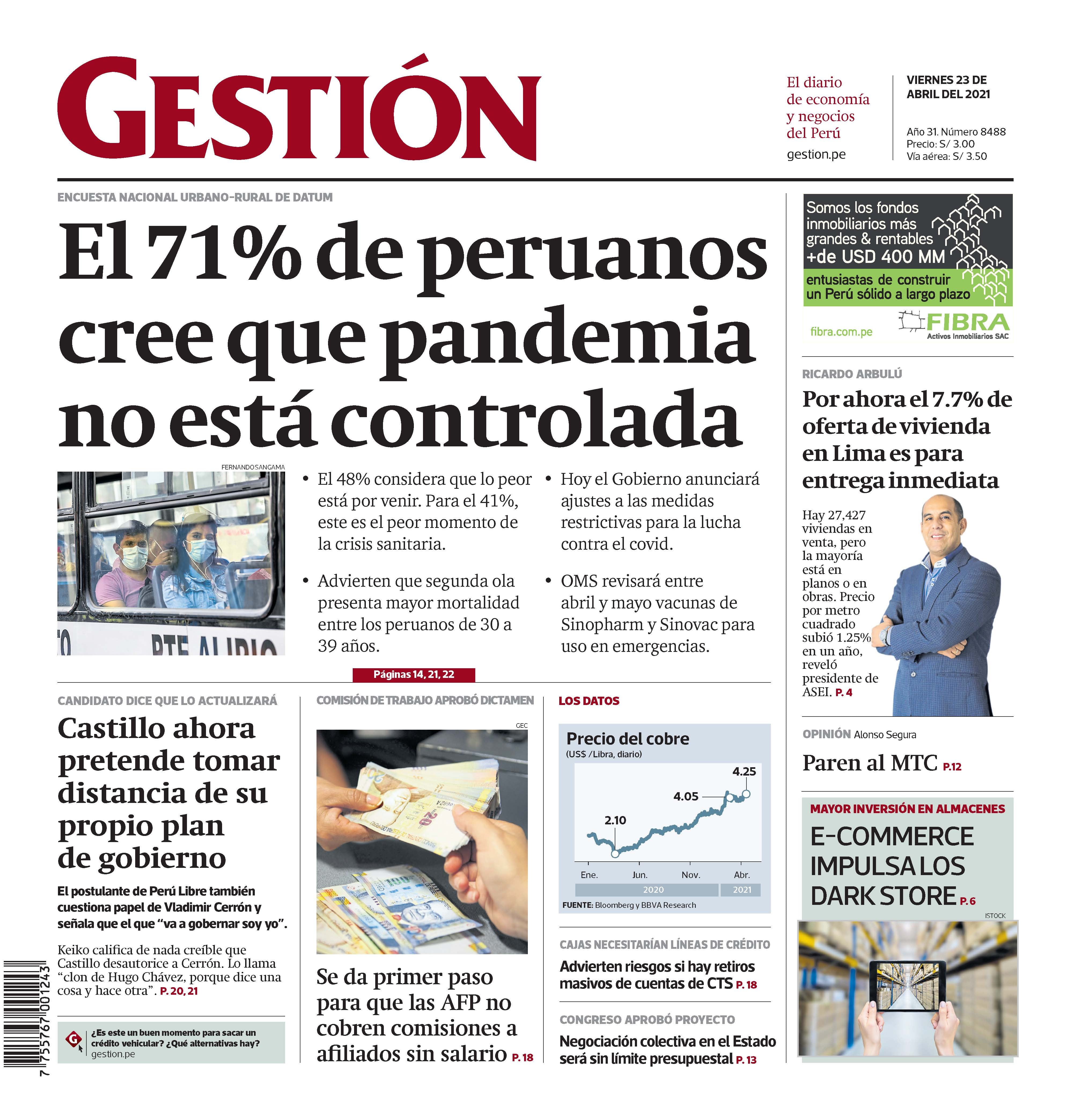 MEl 48% considera que lo peor está por venir. Para el 41%, este es el peor momento de la crisis sanitaria. Advierten que segunda ola presenta mayor mortalidad entre los peruanos de 30 a 39 años. Hoy el Gobierno anunciará ajustes a las medidas restrictivas para la lucha contra el covid. OMS revisará entre abril y mayo vacunas de Sinopharm y Sinovac para uso en emergencias.