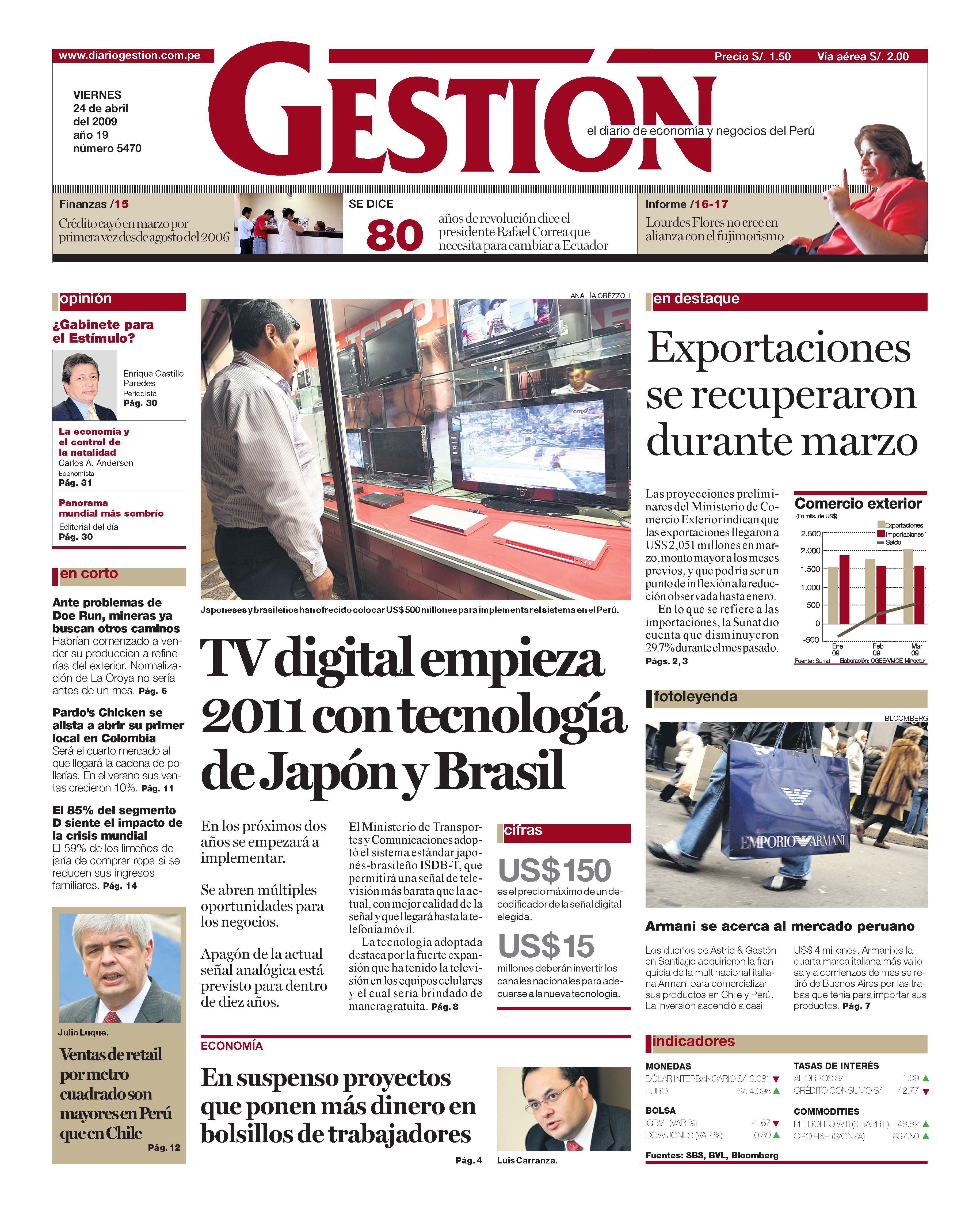 En los próximos dos años se empezará a implementar. Se abren múltiples oportunidades para los negocios. Apagón de la actual señal analógica está previsto para dentro de diez años. El Ministerio de Transportes y Comunicaciones adoptó el sistema estándar japonés-brasileño ISDB-T, que permitirá una señal de televisión más barata que la actual, con mejor calidad de la señal y que llegará hasta la telefonía móvil.