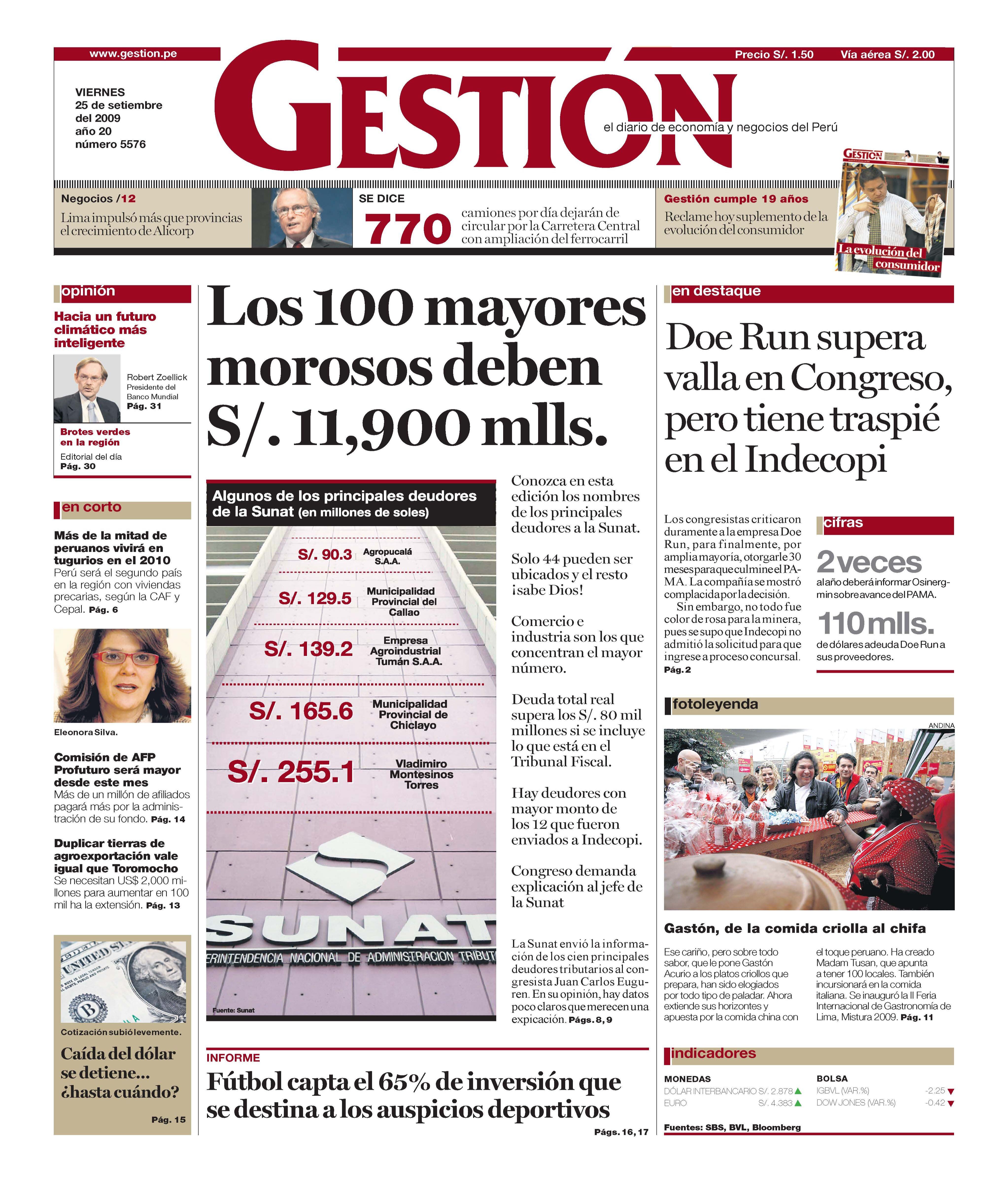 Conozca en esta edición los nombres de los principales deudores a la Sunat. Solo 44 pueden ser ubicados y el resto ¡sabe Dios! Comercio e industria son los que concentran el mayor número. Deuda total real supera los S/. 80 mil millones si se incluye lo que está en el Tribunal Fiscal. Hay deudores con mayor monto de los 12 que fueron enviados a Indecopi. Congreso demanda explicación al jefe de la Sunat.