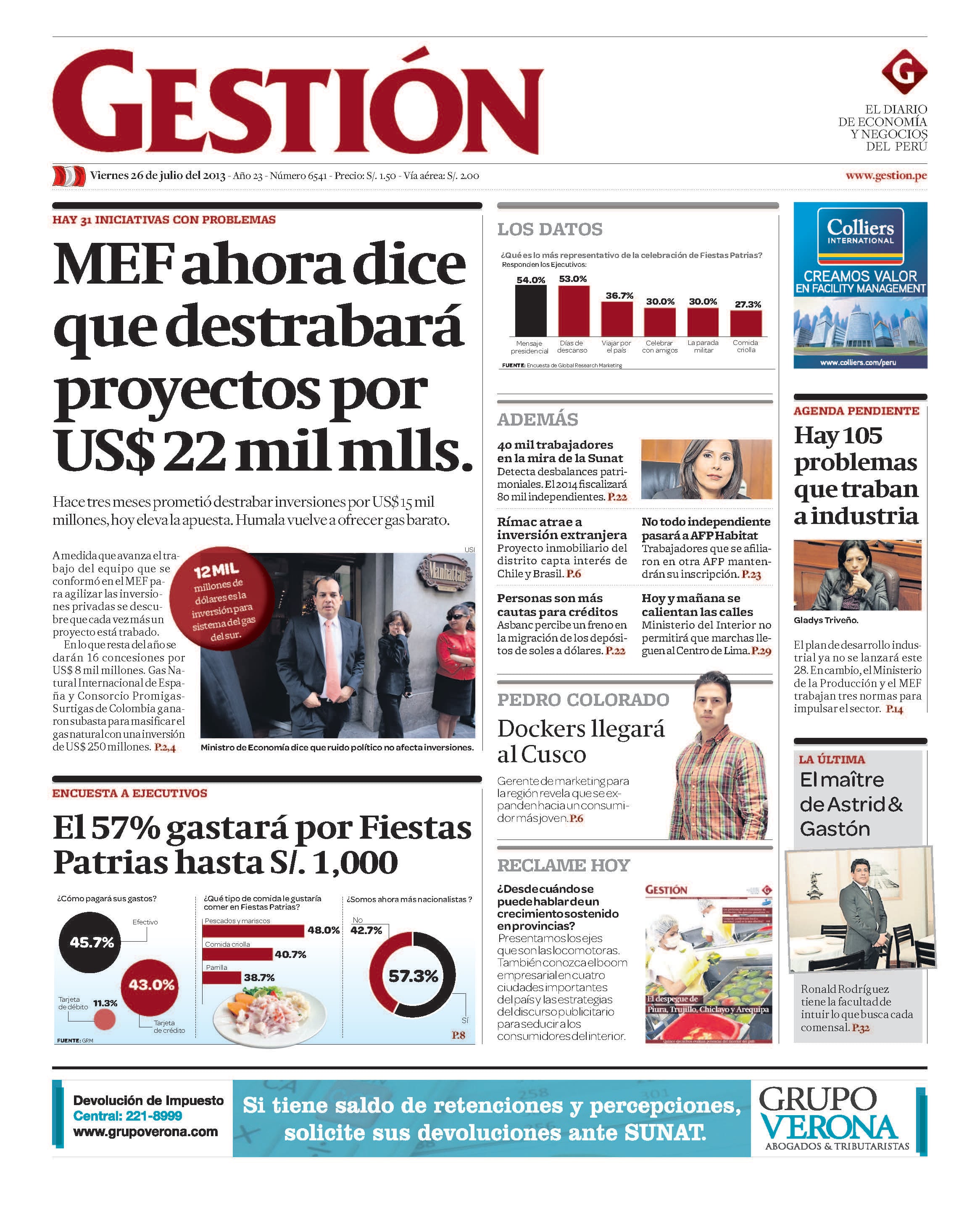 Hace tres meses prometió destrabar inversiones por US$ 15 mil millones, hoy eleva la apuesta. Humala vuelve a ofrecer gas barato. A medida que avanza el trabajo del equipo que se conformó en el MEF para agilizar las inversiones privadas se descubre que cada vez más un proyecto está trabado. En lo que resta del año se darán 16 concesiones por US$ 8 mil millones. Gas Natural Internacional de España y Consorcio Promigas-Surtigas de Colombia ganaron subasta para masificar el gas natural con una inversión de US$ 250 millones.
