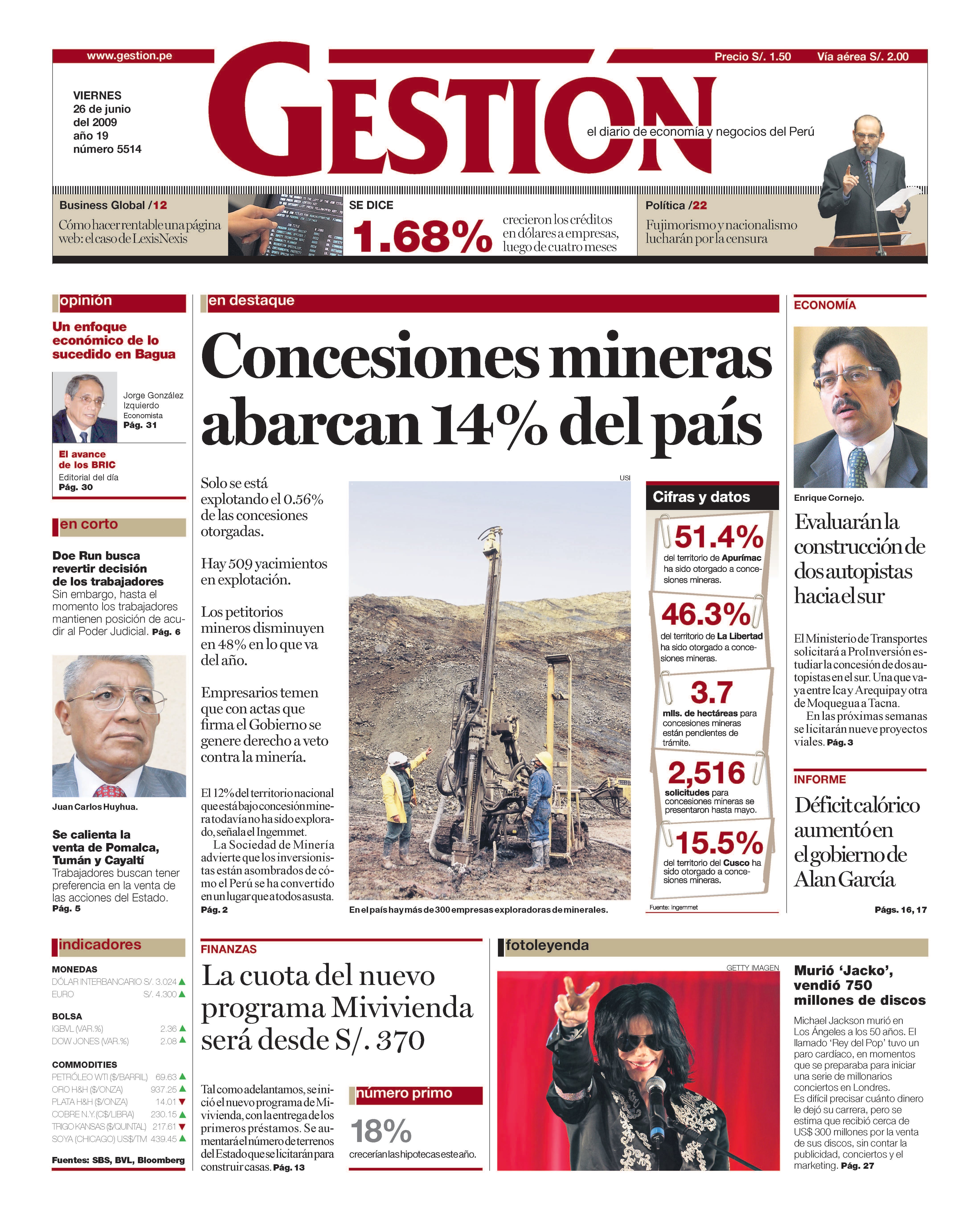 Solo se está explotando el 0.56% de las concesiones otorgadas. Hay 509 yacimientos en explotación. Los petitorios mineros disminuyen en 48% en lo que va del año. Empresarios temen que con actas que firma el Gobierno se genere derecho a veto contra laminería. El 12% del territorio nacional que está bajo concesión minera todavía no ha sido explorado, señala el Ingemmet. La Sociedad de Minería advierte que los inversionistas están asombrados de cómo el Perú se ha convertido en un lugar que a todos asusta.