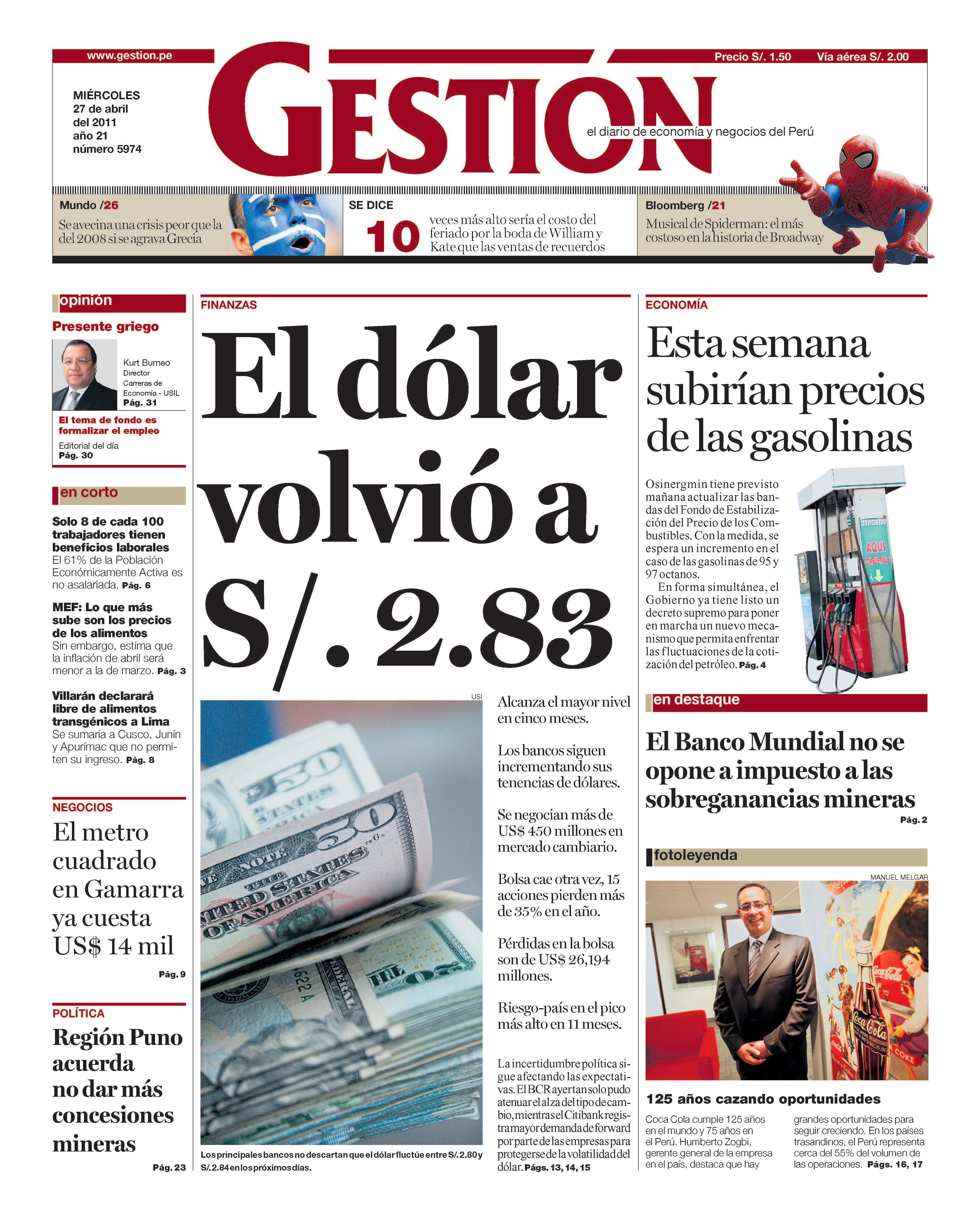 Alcanza el mayor nivel en cinco meses. Los bancos siguen incrementando sus tenencias de dólares. Se negocian más de US$ 450 millones en mercado cambiario. Bolsa cae otra vez, 15 acciones pierden más de 35% en el año. Pérdidas en la bolsa son de US$ 26,194 millones. Riesgo país en el pico más alto en 11 meses. La incertidumbre política sigue afectando las expectativas. El BCR ayer tan solo pudo atenuar el alza del tipo de cambio, mientras el Citibank registra mayor demanda de forward por parte de las empresas para protegerse de la volatilidad del dólar.