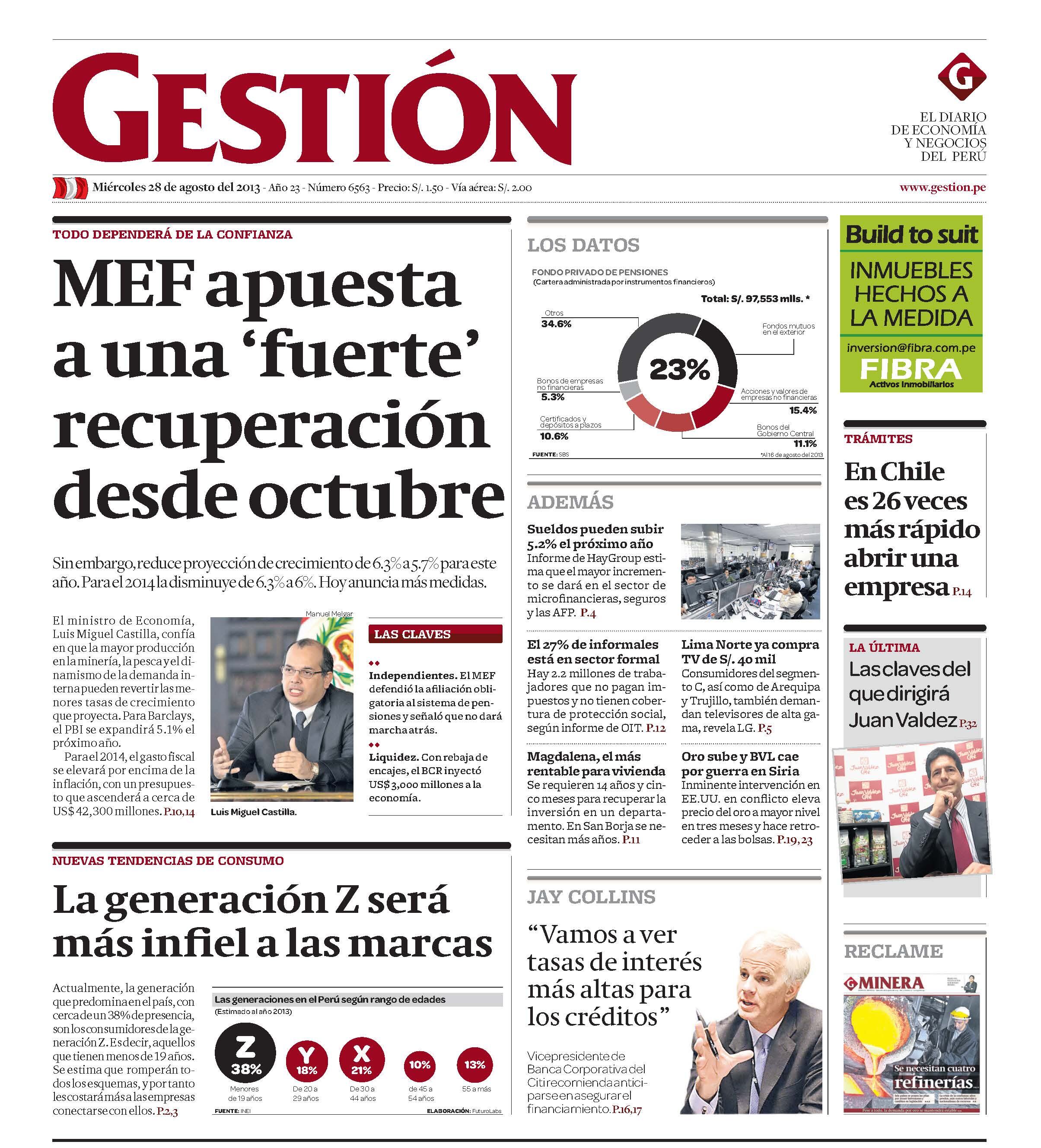 Sin embargo, reduce proyección de crecimiento de 6.3% a 5.7% para este año. Para el 2014 la disminuye de 6.3% a 6%. Hoy anuncia más medidas. El ministro de Economía, Luis Miguel Castilla, confía en que la mayor producción en la minería, la pesca y el dinamismo de la demanda interna pueden revertir las menores tasas de crecimiento que proyecta. Para Barclays, el PBI se expandirá 5.1% el próximo año. Para el 2014, el gasto fiscal se elevará por encima de la inflación, con un presupuesto que ascenderá acerca de US$ 42,300 millones.