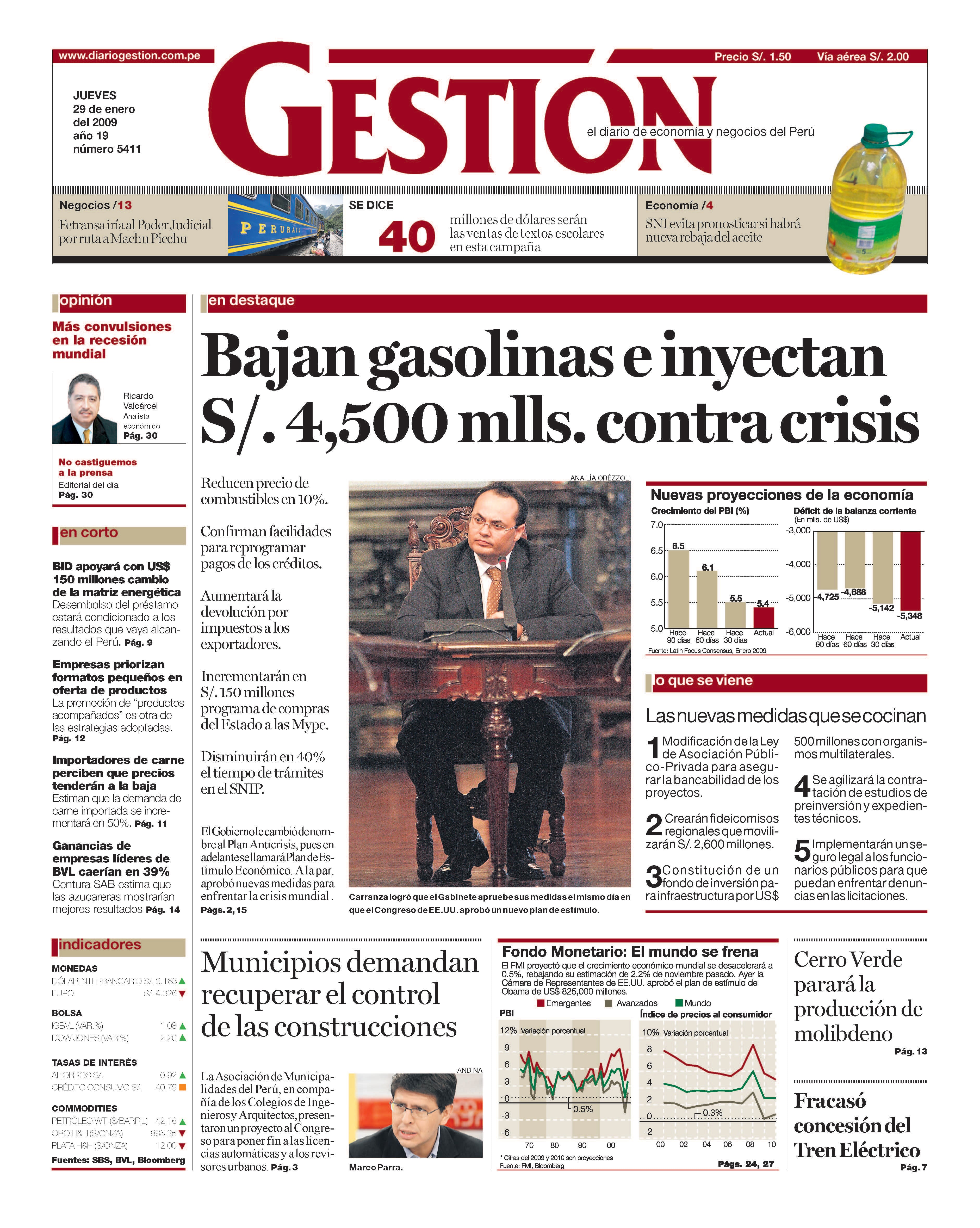 Reducen precio de combustibles en 10%. Confirman facilidades para reprogramar pagos de los créditos. Aumentará la devolución por impuestos a los exportadores. Incrementarán en S/. 150 millones programa de compras del Estado a las Mype. Disminuirán en 40% el tiempo de trámites en el SNIP. El Gobierno le cambió de nombre al Plan Anticrisis, pues en adelante se llamará Plan de Estímulo Económico. A la par, aprobó nuevas medidas para enfrentar la crisis mundial .