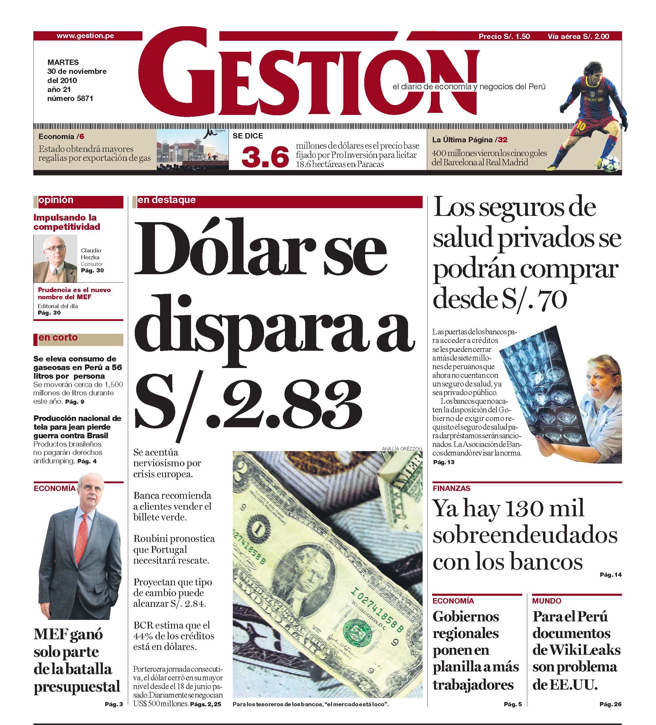 Se acentúa nerviosismo por crisis europea. Banca recomienda a clientes vender el billete verde. Roubini pronostica que Portugal necesitará rescate. Proyectan que tipo de cambio puede alcanzar S/. 2.84. BCR estima que el 44% de los créditos está en dólares. Por tercera jornada consecutiva, el dólar cerró en su mayor nivel desde el 18 de junio pasado. Diariamente se negocian US$ 500 millones.