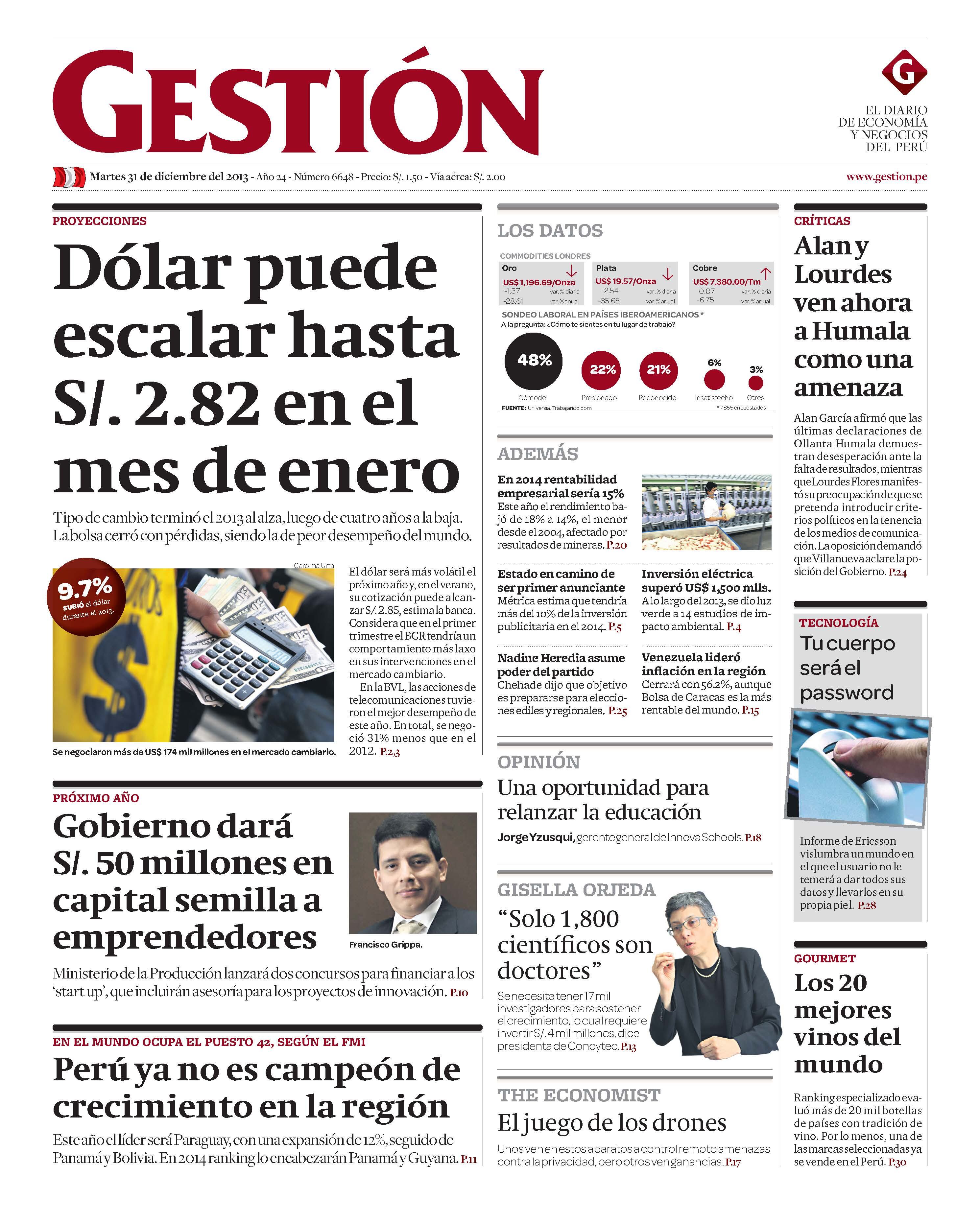 Tipo de cambio terminó el 2013 al alza, luego de cuatro años a la baja. La bolsa cerró con pérdidas, siendo la de peor desempeño del mundo. El dólar será más volátil el próximo año y, en el verano, su cotización puede alcanzar S/. 2.85, estima la banca. Considera que en el primer trimestre el BCR tendría un comportamiento más laxo en sus intervenciones en el mercado cambiario.