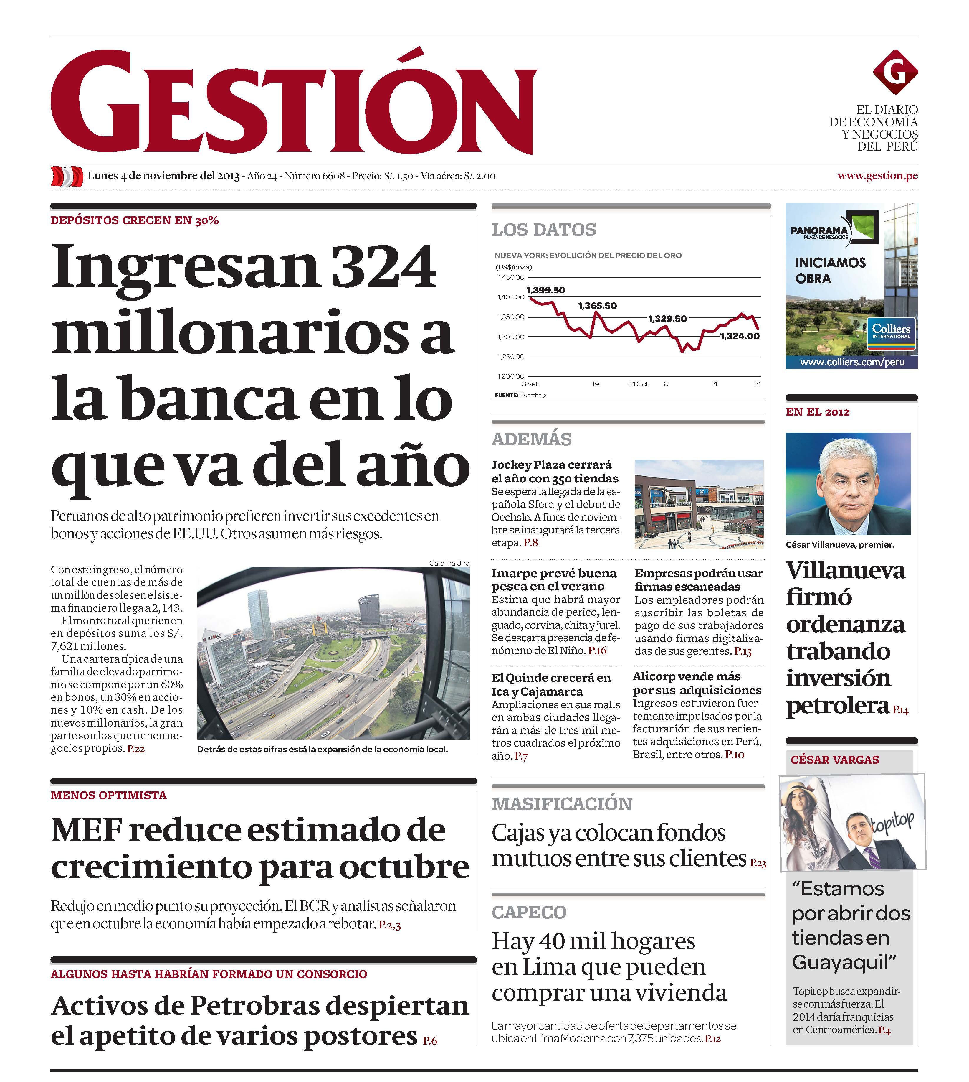 Peruanos de alto patrimonio prefieren invertir sus excedentes en bonos y acciones de EE.UU. Otros asumen más riesgos. Con este ingreso, el número total de cuentas de más de un millón de soles en el sistema financiero llega a 2,143. El monto total que tienen en depósitos suma los S/. 7,621 millones. Una cartera típica de una familia de elevado patrimonio se compone por un 60% en bonos, un 30% en acciones y 10% en cash. De los nuevos millonarios, la gran parte son los que tienen negocios propios.