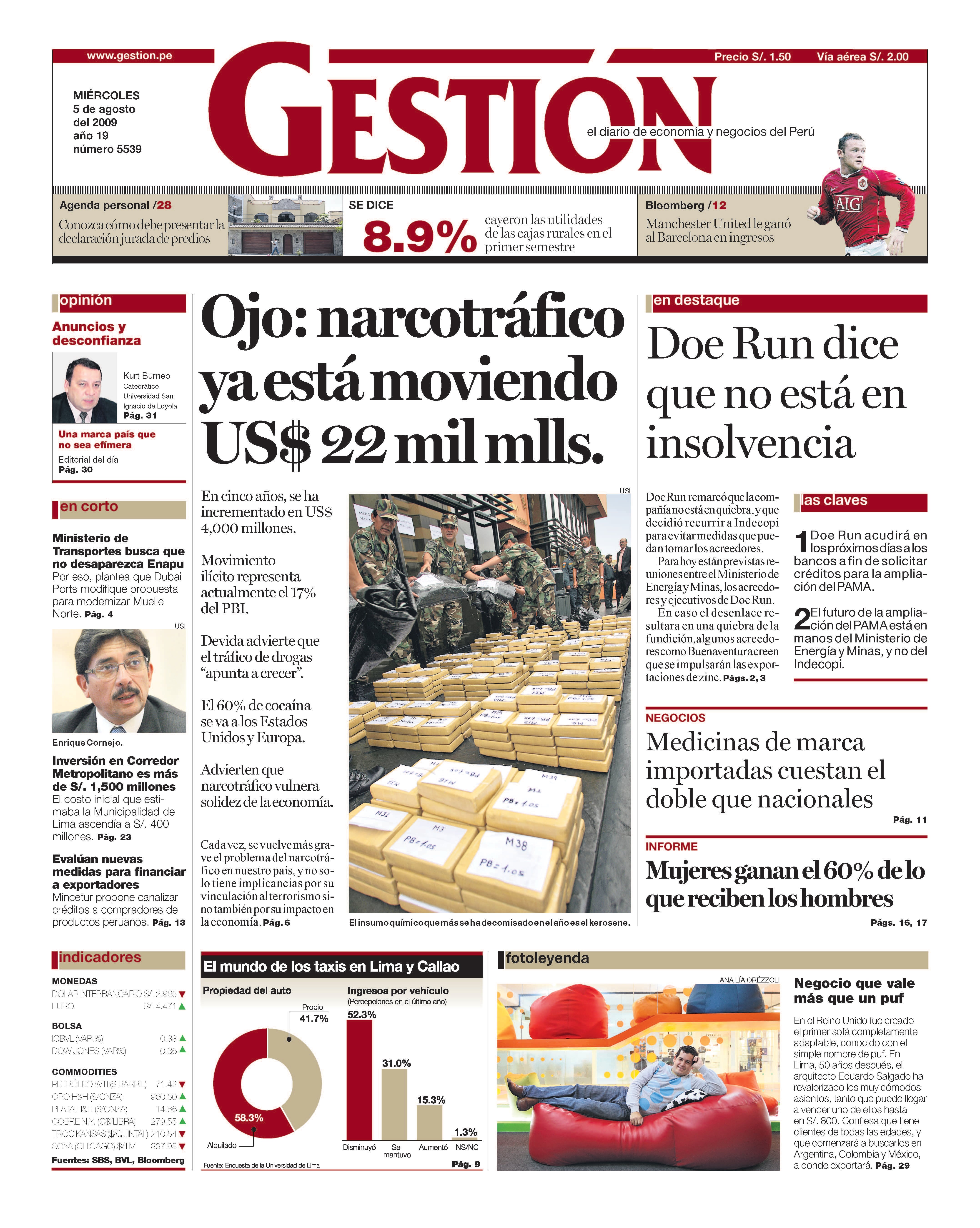En cinco años, se ha incrementado en US$ 4,000 millones. Movimiento ilícito representa actualmente el 17% del PBI. Devida advierte que el tráfico de drogas “apunta a crecer”. El 60% de cocaína se va a los Estados Unidos y Europa. Advierten que narcotráfico vulnera solidez de la economía. Cada vez, se vuelve más grave el problema del narcotráfico en nuestro país, y no solo tiene implicancias por su vinculación al terrorismo sino también por su impacto en la economía.