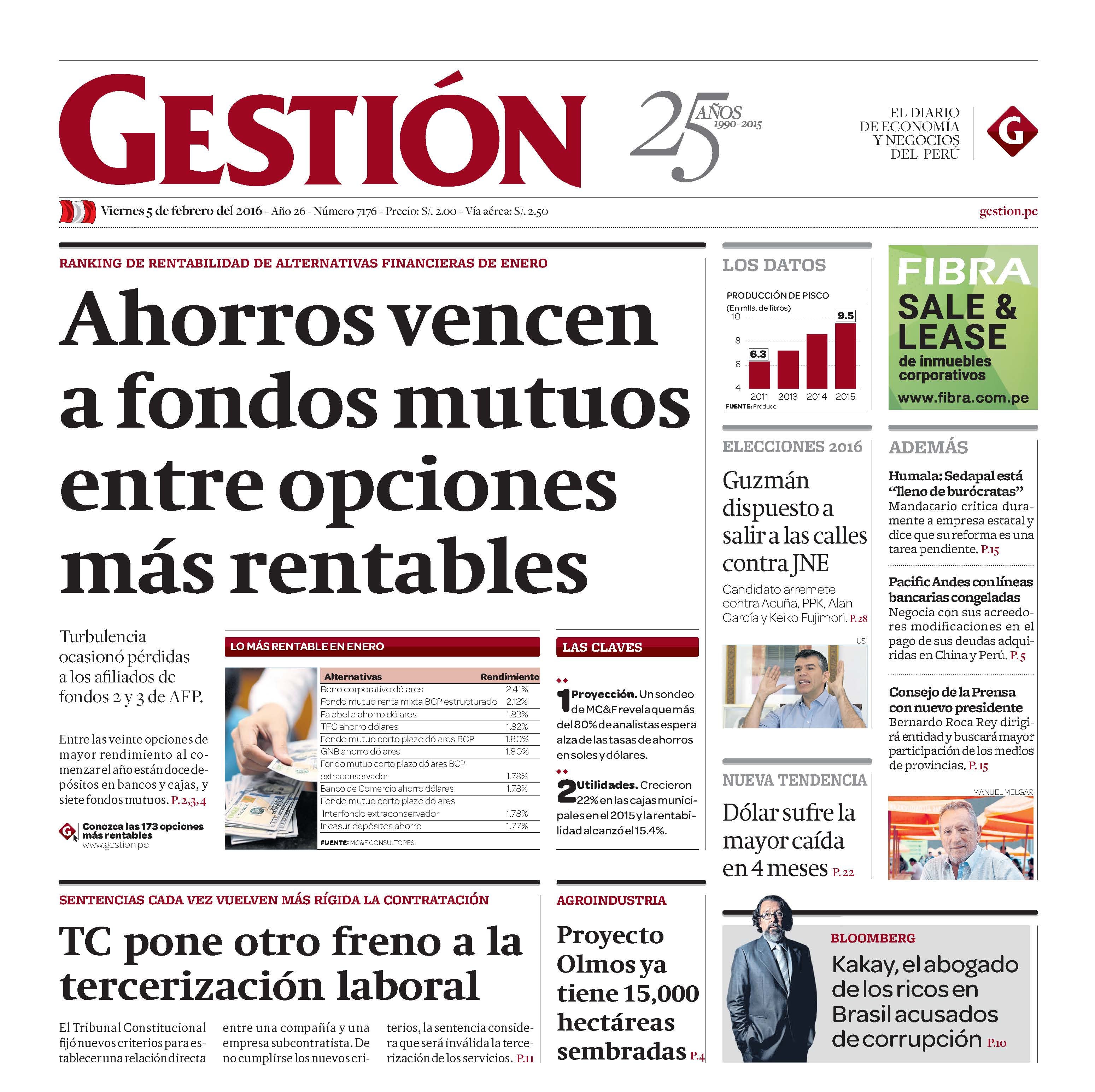 Turbulencia ocasionó pérdidas a los afiliados de fondos 2 y 3 de AFP. Entre las veinte opciones de mayor rendimiento al comenzar el año están doce depósitos en bancos y cajas, y siete fondos mutuos. Un sondeo de MC&F revela que más del 80% de analistas espera alza de las tasas de ahorros en soles y dólares. 2 Utilidades. Crecieron 22% en las cajas municipales en el 2015 y la rentabilidad alcanzó el 15.4%.