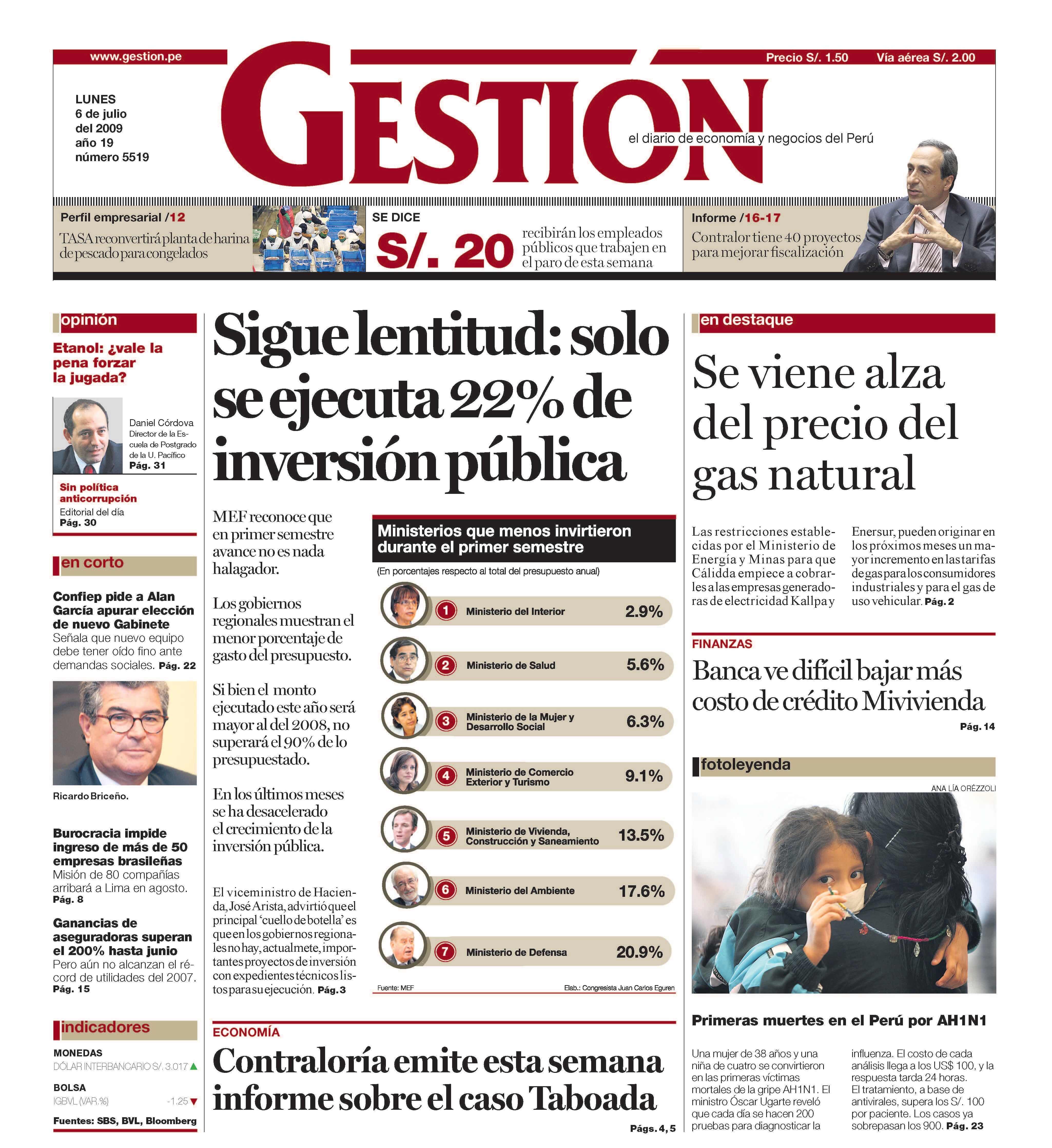 MEF reconoce que en primer semestre avance no es nada halagador. Los gobiernos regionales muestran el menor porcentaje de gasto del presupuesto. Si bien el monto ejecutado este año será mayor al del 2008, no superará el 90% de lo presupuestado. En los últimos meses se ha desacelerado el crecimiento de la inversión pública. El viceministro de Hacienda, José Arista, advirtió que el principal ‘cuello de botella’ es que en los gobiernos regionales no hay, actualmente, importantes proyectos de inversión con expedientes técnicos listos para su ejecución.