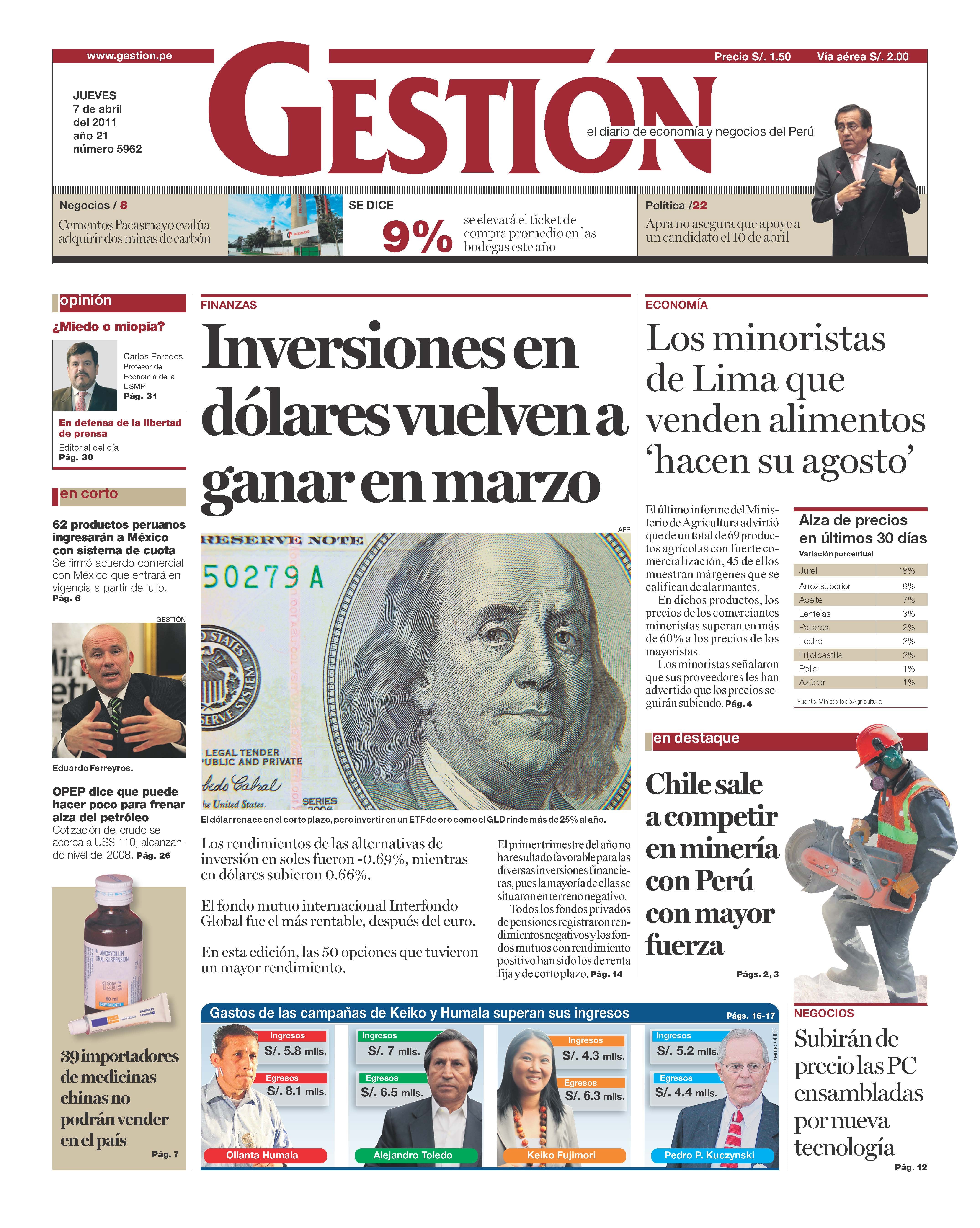 Los rendimientos de las alternativas de inversión en soles fueron -0.69%, mientras en dólares subieron 0.66%. El fondo mutuo internacional Interfondo Global fue el más rentable, después del euro. En esta edición, las 50 opciones que tuvieron un mayor rendimiento. El primer trimestre del año no ha resultado favorable para las diversas inversiones financieras, pues la mayoría de ellas se situaron en terreno negativo. Todos los fondos privados de pensiones registraron rendimientos negativos y los fondos mutuos con rendimiento positivo han sido los de renta fija y de corto plazo.