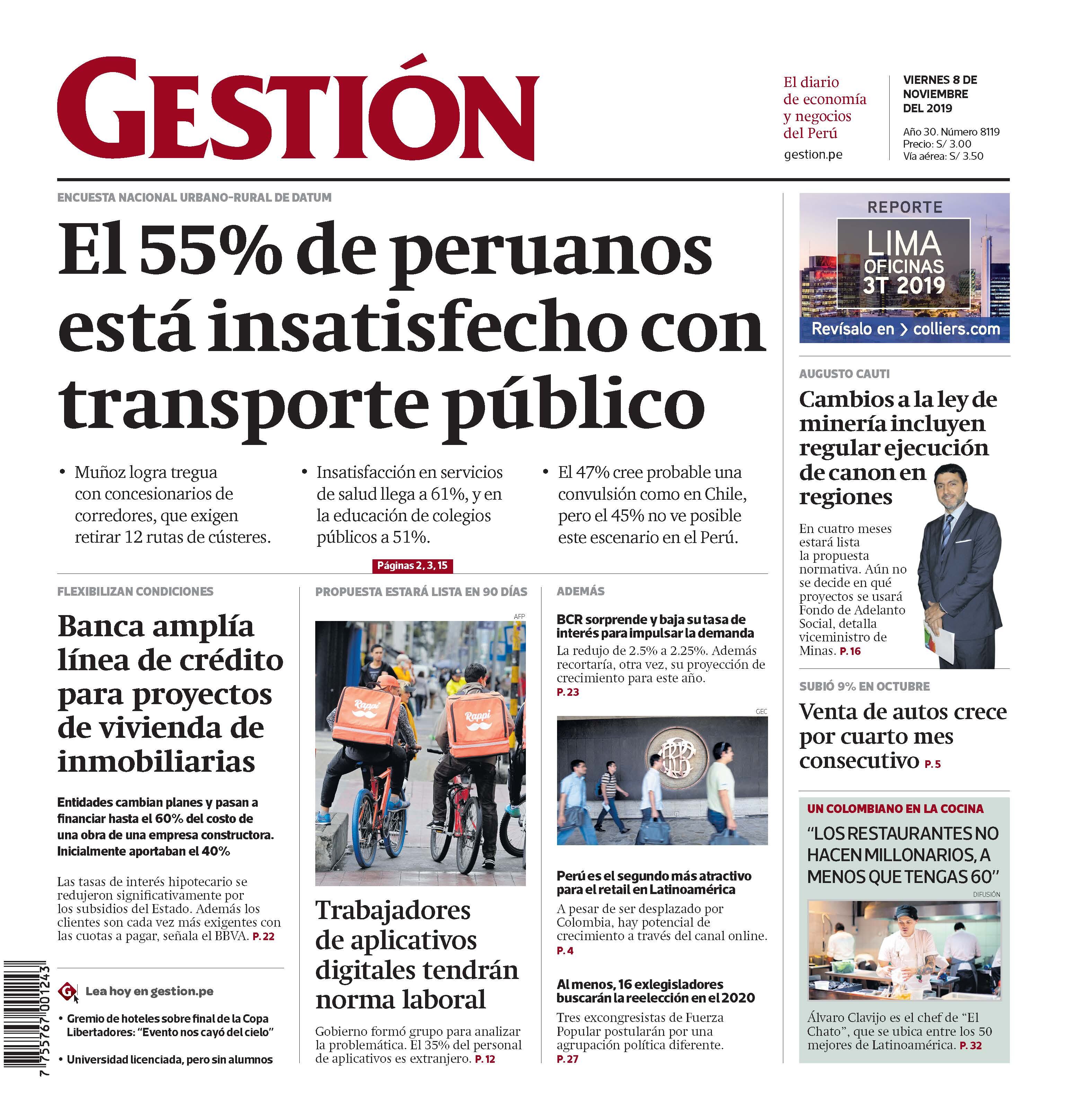 Muñoz logra tregua con concesionarios de corredores, que exigen retirar 12 rutas de cústeres. Insatisfacción en servicios de salud llega a 61%, y en la educación de colegios públicos a 51%. El 47% cree probableuna convulsión como en Chile, pero el 45% no ve posible este escenario en el Perú.