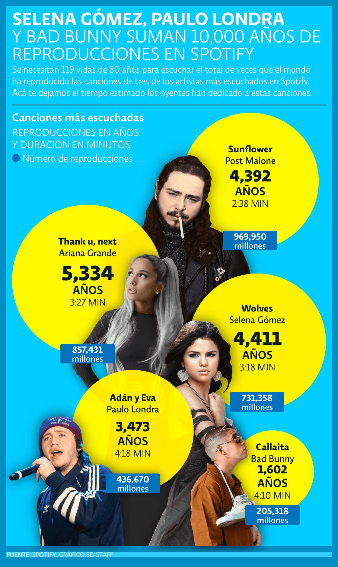 Se necesitan 119 vidas de 80 años para escuchar el total de veces que el mundo ha reproducido las canciones de tres de los artistas más escuchados en Spotify. Acá te dejamos el tiempo estimado los oyentes han dedicado a estas canciones.