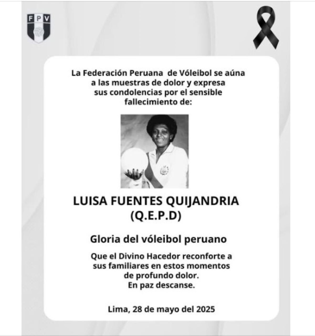 A través de las redes sociales, la FPV lamentó la partida de esta gloria del deporte peruano con un sentido mensaje: “Querida Lucha, te convertiste en leyenda y vivirás para siempre en el corazón de todos los peruanos que gozamos con tu potencia, liderazgo y amor al país”.