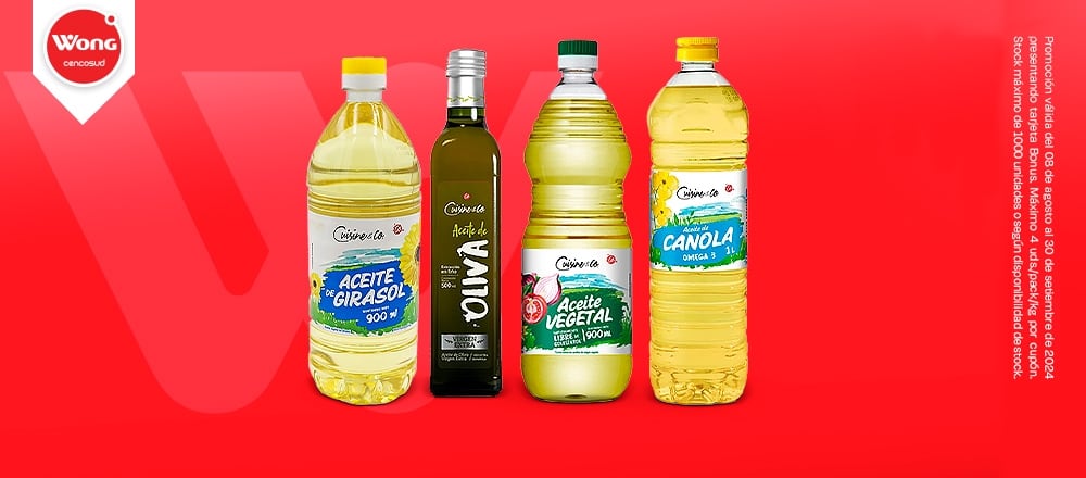 Cocina todos tus platos favoritos con Wong. Accede al 10% de descuento en aceites de Girasol, Canola y Oliva Cuisine & Co en tiendas físicas Wong a nivel nacional.