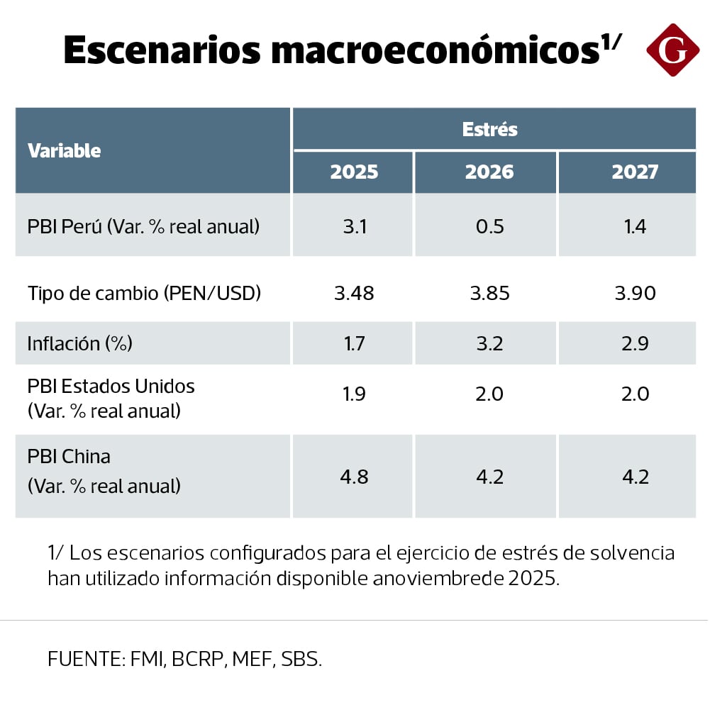 En un escenario de estrés, cuya probabilidad es baja según la SBS, pues implica el escalamiento de conflictos sociales y agudización de la inestabilidad política; la confianza empresarial en tramo pesimista y posibilidad de rebajas en la calificación crediticia soberana; el sistema financiero mantendría un ratio de capital global de alrededor de 16.1%, permaneciendo por encima del mínimo regulatorio de 10%.