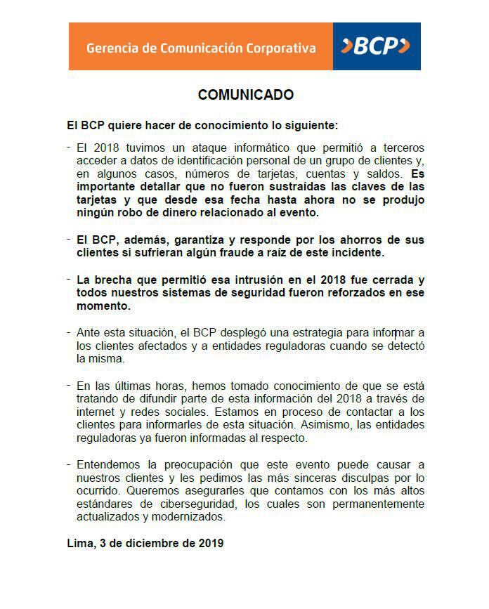 El BCP reconoció que sufrió un ataque cibernético en 2018, que “permitió a terceros acceder a datos de identificación personal de un grupo de clientes y, en algunos casos, números de tarjetas, cuentas y saldos”, según detalló en un comunicado.