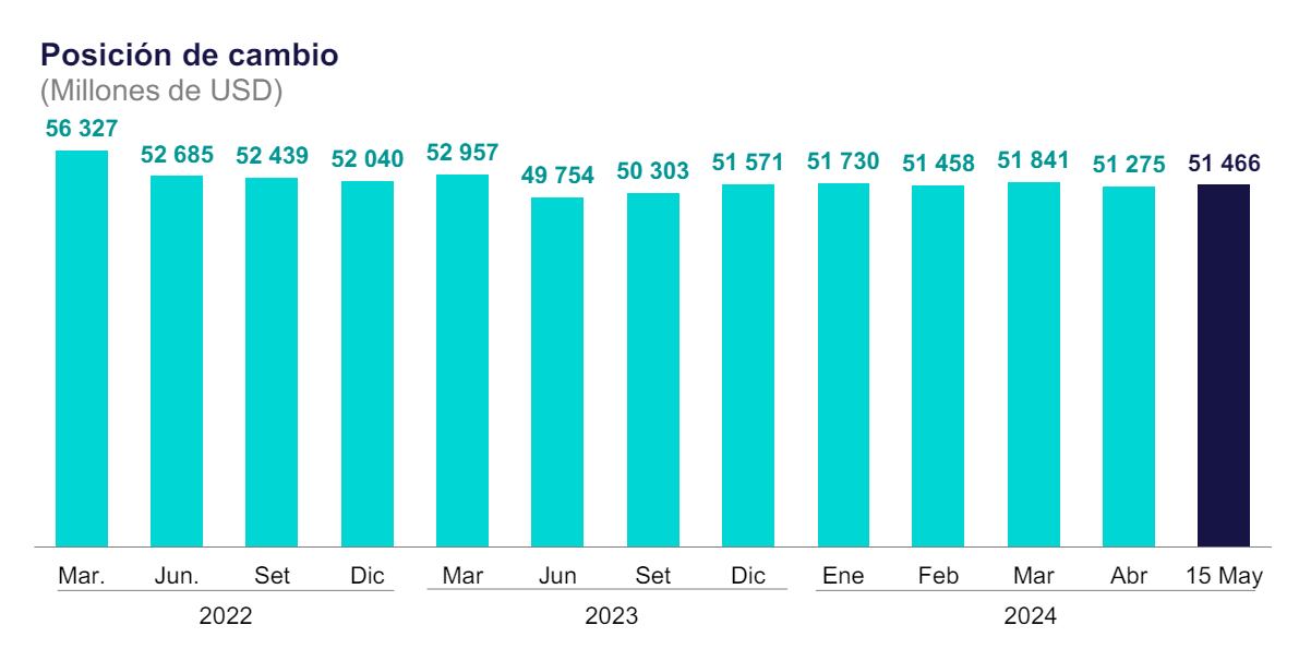 Al 15 de mayo del 2024, la posición de cambio fue de US$ 51,466 millones, un monto menor en US$ 105 millones a la del cierre de diciembre del 2023.
