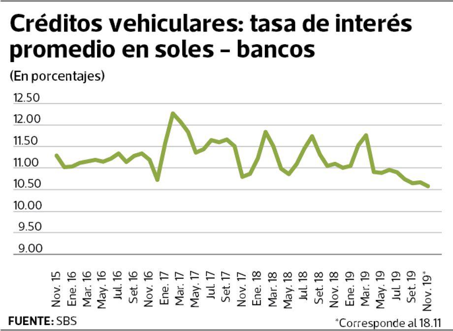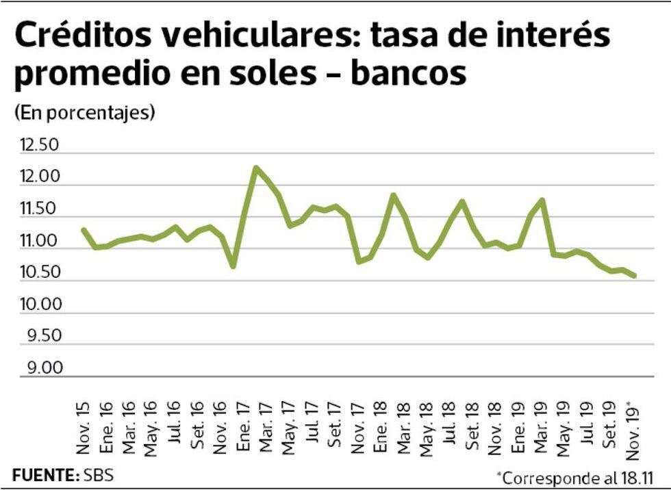 Incluso en este mes el costo de los préstamos vehiculares se redujo a su menor nivel desde enero del 2015 , detalló AAP. “La tasa de interés promedio de los créditos otorgados por los bancos para la compra de vehículos se ubicó en 10.58% el 18 de noviembre del 2019. Según los datos de la SBS, dicha tasa es la menor de los últimos 59 meses”, resaltó Morisaki.