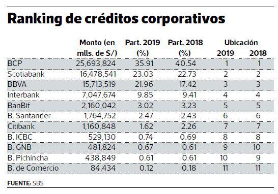 Si bien el BCP se mantuvo en la punta del ranking de créditos corporativos (grandes compañías), su participación se redujo sustancialmente, de 40.54% a 35.91% . En la otra orilla, BBVA elevó su cuota de 17.42% a 21.96%, aunque todavía por debajo de Scotiabank, que retiene el segundo lugar merced a una estrategia más agresiva que otros bancos en el ámbito corporativo.