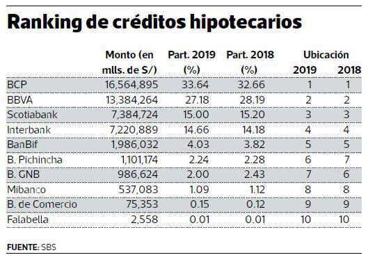 En el 2019, el BCP retuvo el primer lugar en participación en el financiamiento para adquisición de viviendas, cuota que engrosó de 32.66% a 33.64% del monto total de créditos hipotecarios del sistema bancario.