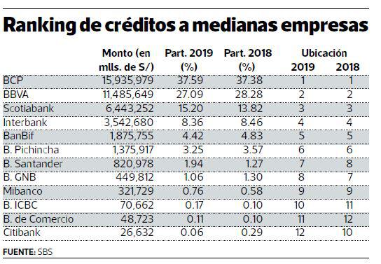 Este último, por el contrario, ganó puntos en los créditos a medianas empresas, pero aún escolta al BCP y BBVA.