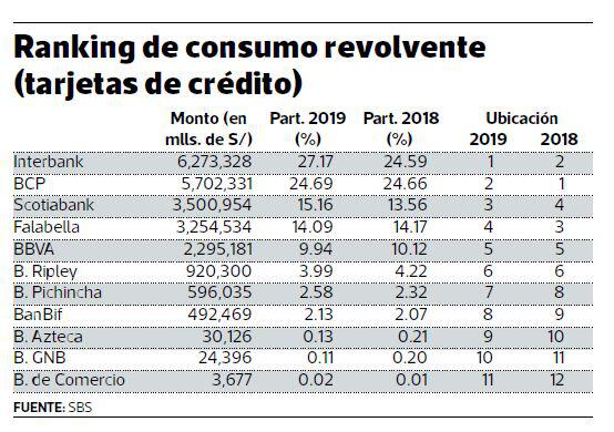 En los créditos de consumo revolvente (tarjetas), Interbank recuperó el liderazgo despojando de ese sitial al BCP. El primero elevó su market share de 24.59% a 27.17% en el 2019, mientras que el banco del holding Credicorp tuvo un tibio avance (de 24.66% a 24.69%).